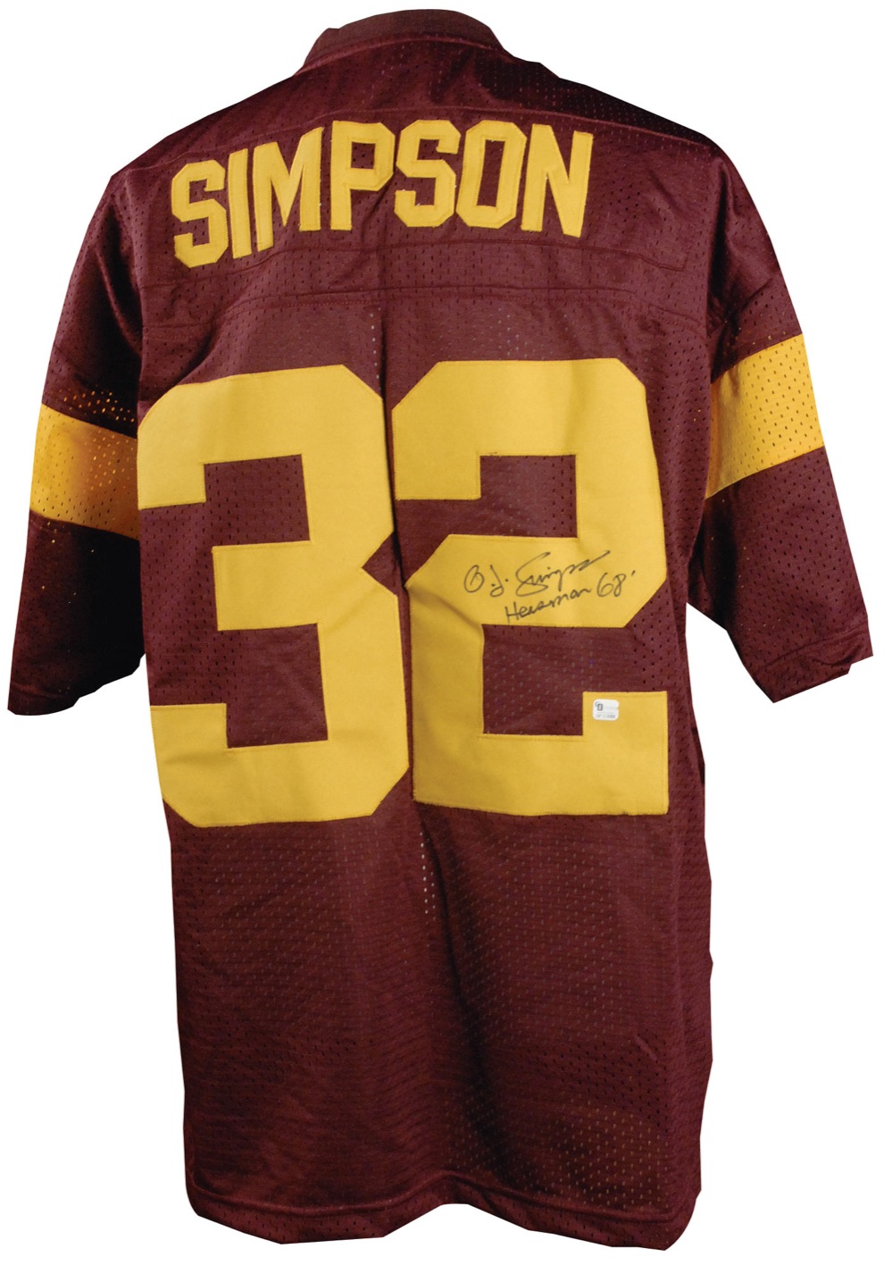 Replica USC football jersey, with sewn on letters and numbers, signed in black felt tip on the number on the back, “O. J. Simpson, Heisman 68.” In fine condition. Pre-certified Steve Grad/PSA/DNA and RRAuction COA.