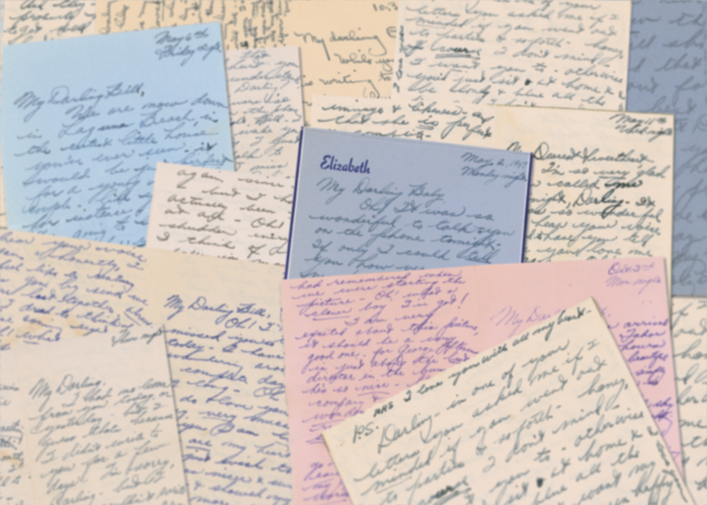 An eight-page letter signed “Elizabeth” and dated March 26, [1949]. Taylor gushes over Pawley and how much she misses him, then focusing on the media scandal of her two-sided love life—publicly dating Heisman Trophy winner Glenn Davis and privately dating Pawley. “It has been so awful since I’ve been home with all the reporters calling up & asking if Glenn [Davis] & I have broken up—At first I just didn’t know what to say, but then we all talked it over & decided to say ‘Well, we’re not engaged but we are still good friends and have not broken up”—If I say anything else it will become a national problem or something, and this way it can die a slow death without too much comment (I hope) But actually, Glenn & I have made an agreement just to go to social events together where there are some nosy reporters—like the Academy Awards and some big premiere next week—but otherwise we are completely through.”