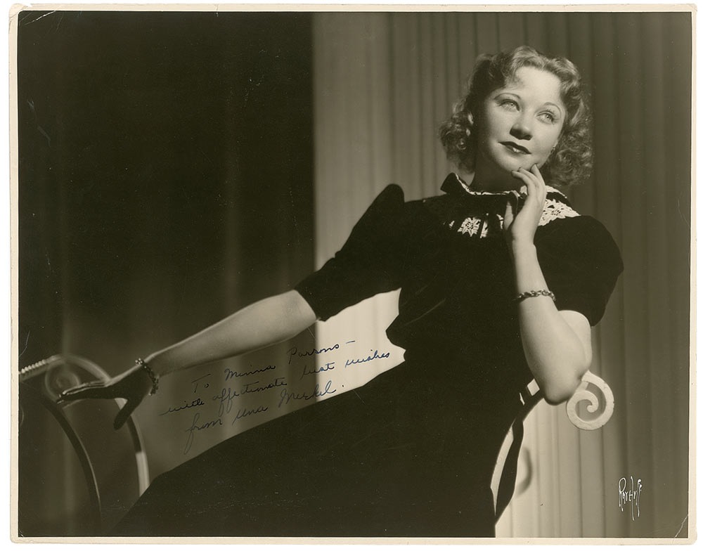 Vintage matte-finish 13.5 x 10.75 photo of Merkel reclining in a chair, signed and inscribed in fountain pen “To Minnie Parsons—with affectionate best wishes from Una Merkel.” Some light creasing and surface impressions, and silvering to some of the darker portions, otherwise fine condition. Pre-certified PSA/DNA and RRAuction COA.