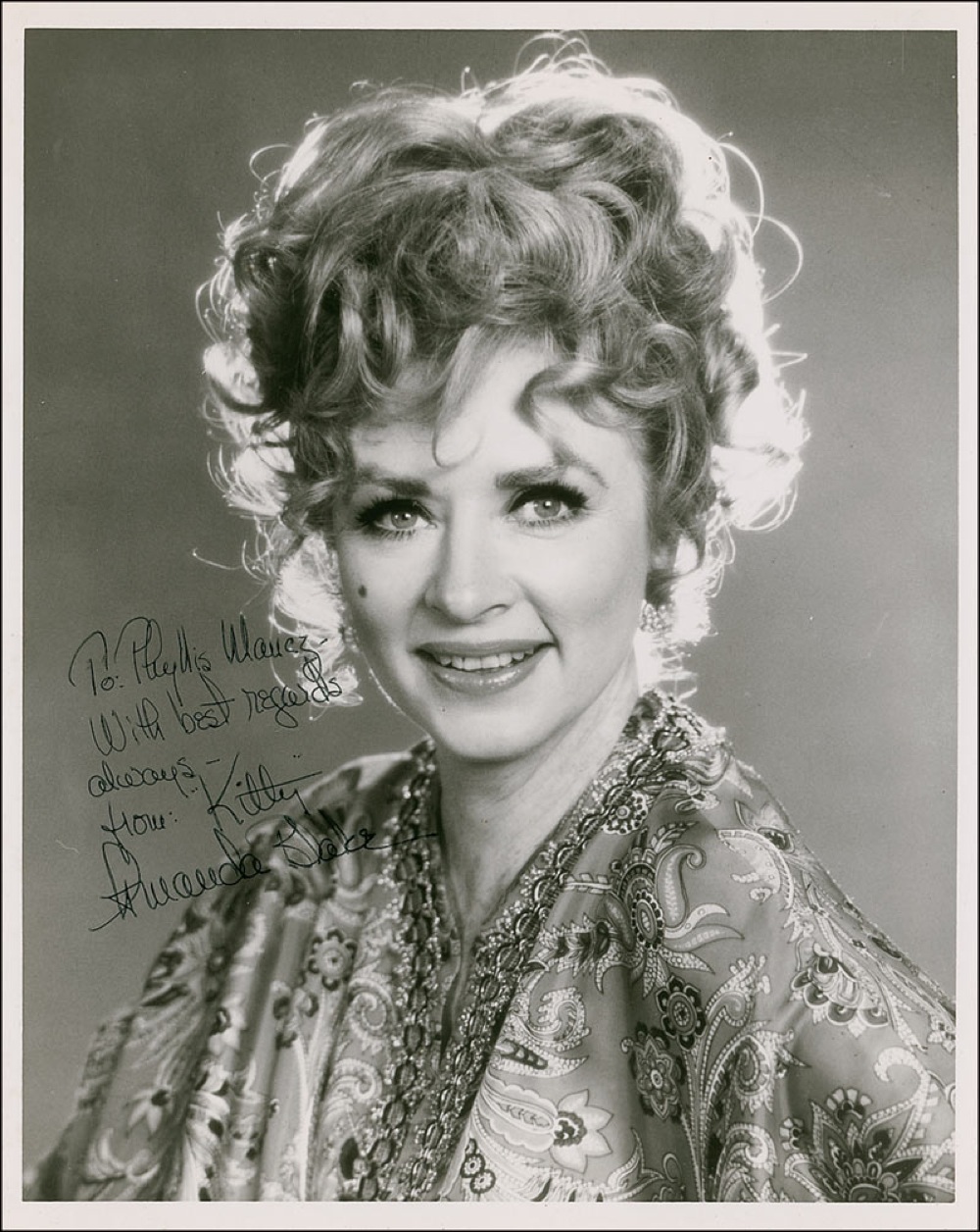 Best remembered for the role of Miss Kitty on Gunsmoke. Glossy 8 x 10 photo, signed and inscribed in black ink, “To Phyllis Mancz–with best regards always from ‘Kitty’ Amanda Blake”; and a one-page TLS signed by Blake, dated August 10, 1973, acknowledging the photo. In fine condition. Pre-certified PSA/DNA and RRAuction COA.