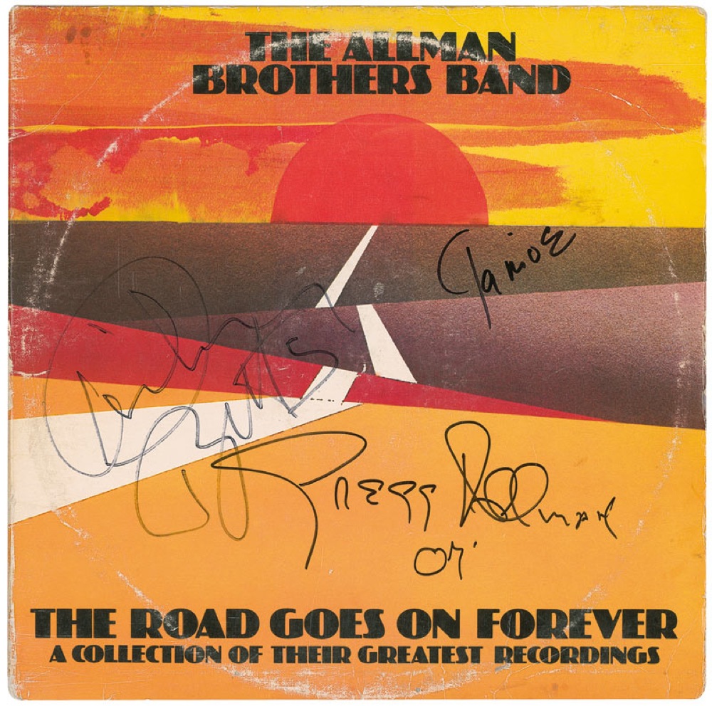 The Road Goes on Forever album signed on the front cover in felt tip by Gregg Allman, Dickey Betts, and Jaimoe. In very good condition, with moderate ‘ring of wear’ to covers, and scattered creases, soiling and edge wear. The record is included. Accompanied by a photo of Allman taken at time of signing. Pre-certified Roger Epperson/REAL and RRAuction COA.