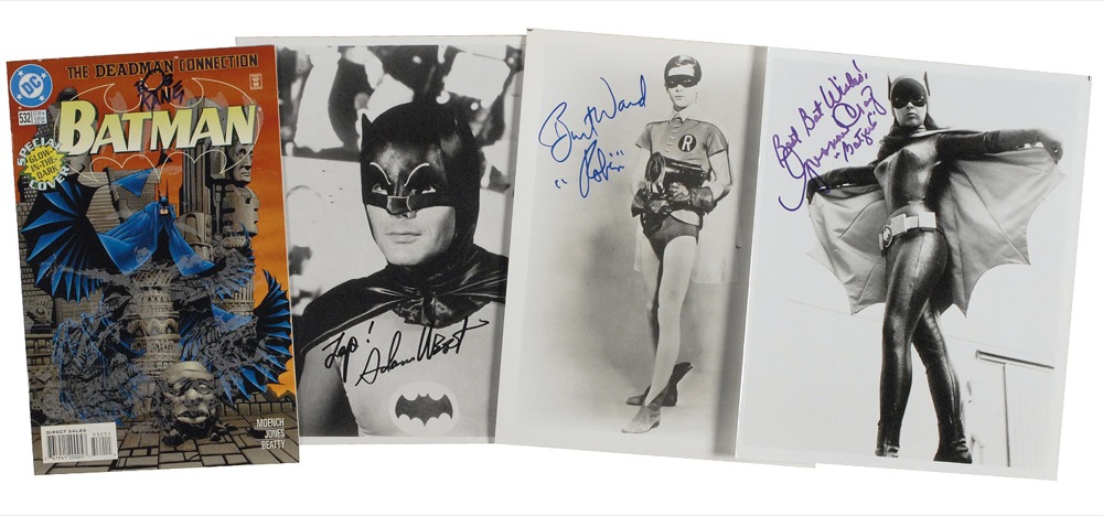 Four items: three glossy 8 x 10 photos of Batman, Robin, and Batgirl, signed in felt tip by Adam West, Burt Ward, and Yvonne Craig respectively, with Ward and Craig adding their character name and West adding “Zap!”; and a 1996 DC Comic ‘Batman’ comic book signed in blue felt tip by Bob Kane. In overall fine condition. RRAuction COA.