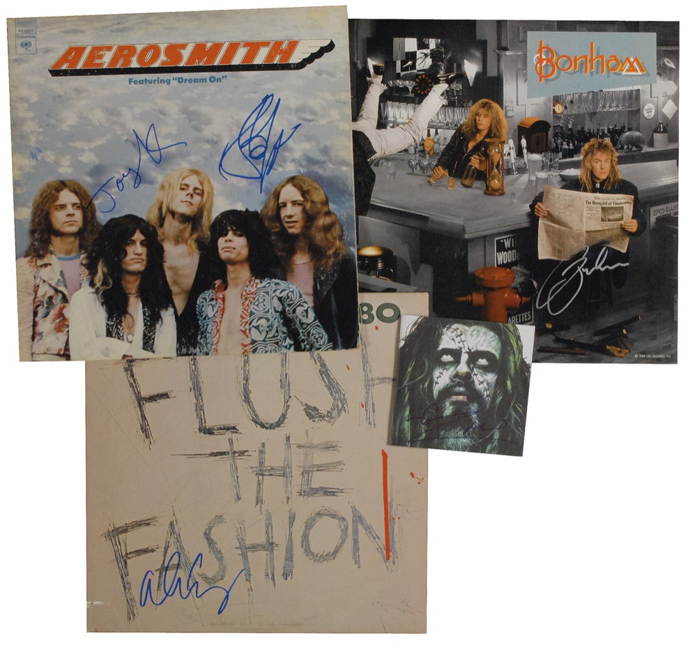 Four items: two albums, Aerosmith signed in blue felt tip by Steven Tyler and Joey Kramer, and Flush the Fashion signed in blue felt tip by Alice Cooper; Bonham album flat signed in silver ink by Jason Bonham; and CD booklet signed in blue felt tip by Rob Zombie. In overall very good to fine condition with scattered creasing, surface wear, and a discount cut to the spine of Cooper’s album. The albums are included. RRAuction COA.