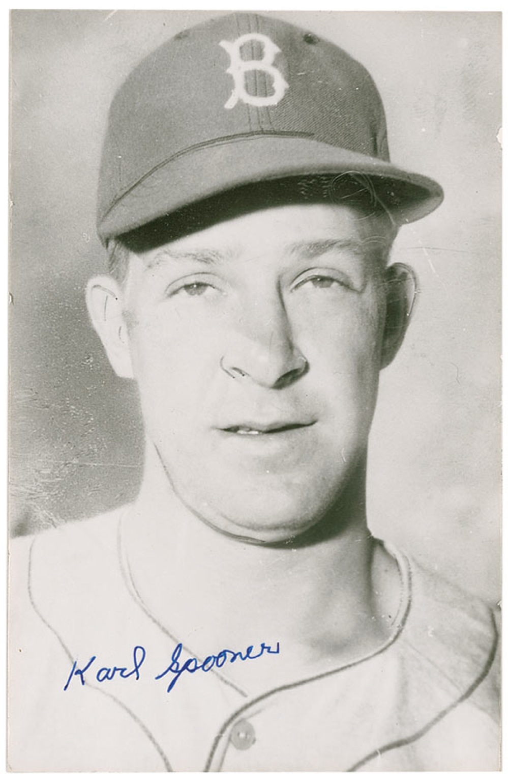 Joined the Brooklyn Dodgers in 1954 and pitched back-to-back shutouts against the Giants and Pirates, striking out 27 batters. He retired the next season due to injury. Scarce 3.5 x 5.5 postcard photo of Spooner in his Dodgers uniform, signed in blue ink. In fine condition, with some scattered light surface marks. Pre-certified Steve Grad/PSA/DNA and RRAuction COA.