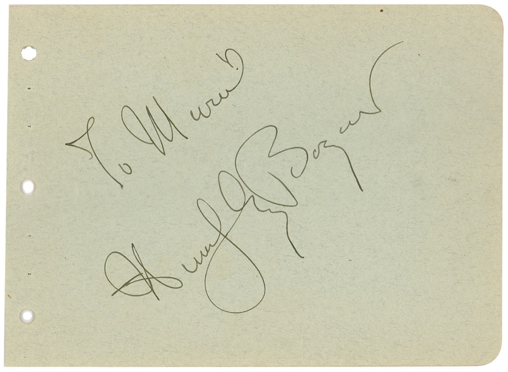 Vintage fountain pen signature, “To Muriel, Humphrey Bogart,” on a light green 6 x 4.5 album page. In fine condition, with a light diagonal crease affecting a few letters in last name of signature. Pre-certified PSA/DNA and RRAuction COA.