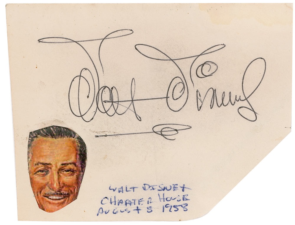 Vintage ballpoint signature, “Walt Disney,” on an off-white 4.5 x 3.5 trimmed slip, with a small clipped photo affixed to lower left corner, and collector’s notation reading “Walt Disney, Charter House, August 5, 1958.” In very good condition, with a central vertical fold, clipped lower right corner, and a bit of scattered light soiling. Pre-certified PSA/DNA and RRAuction COA.