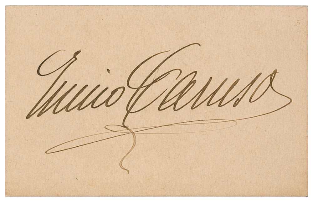 Vintage fountain pen signature, “Enrico Caruso,” on an off-white 3.25 x 2 card. A uniform shade of toning, otherwise fine condition. Pre-certified PSA/DNA and RRAuction COA.