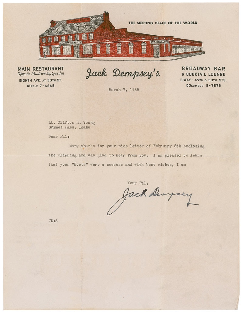 TLS, one page, 8.5 x 11, Jack Dempsey’s Restaurant letterhead, March 7, 1939. Letter to Clifton Young. In full: “Many thanks for your nice letter of February 8th enclosing the clipping and was glad to hear from you. I am pleased to learn that your ‘Bouts’ were a success and with best wishes, I am …” Intersecting folds, one through a single letter of signature, and a uniform shade of mild toning, otherwise fine condition. Pre-certified Steve Grad/PSA/DNA and RRAuction COA.