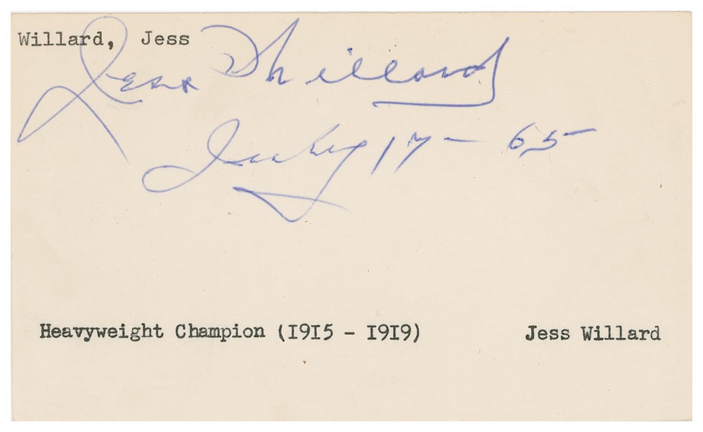 Boxing Hall of Famer (1881-1968) and former world heavyweight champion. Ballpoint signature, “Jess Willard, July 17 – 65,” on a 5 x 3 off-white card, with collector’s typed notations to top and bottom. In fine condition. Pre-certified Steve Grad/PSA/DNA and RRAuction COA.