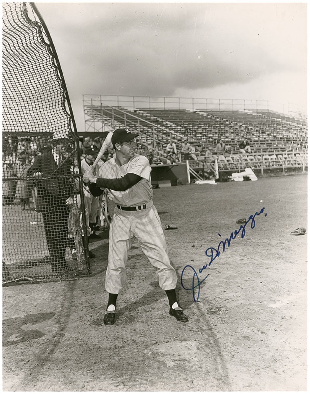 Glossy 11 x 14 photo of DiMaggio taking batting practice, signed in black felt tip. In fine condition, with some scattered light surface marks. Pre-certified Steve Grad/PSA/DNA and RRAuction COA.
