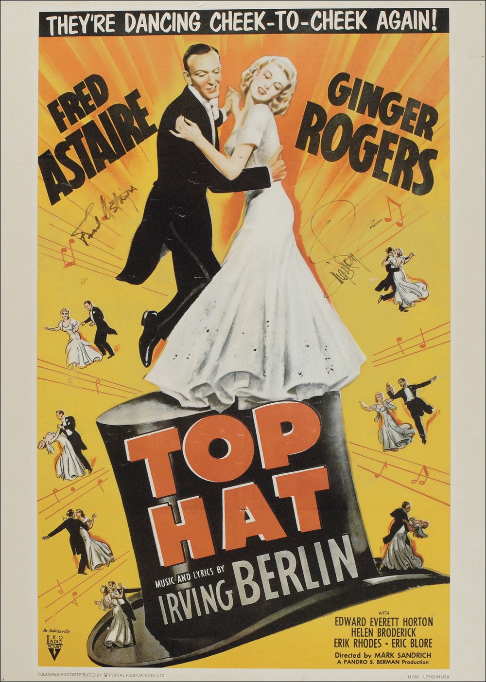 Color 20 x 28 poster of a film poster for Top Hat, signed in black felt tip by Fred Astaire and Ginger Rogers. Rolled and in very good condition, with light overall creases, tape remnants to top edge on reverse, and a small tear to right border. Pre-certified PSA/DNA and RRAuction COA.