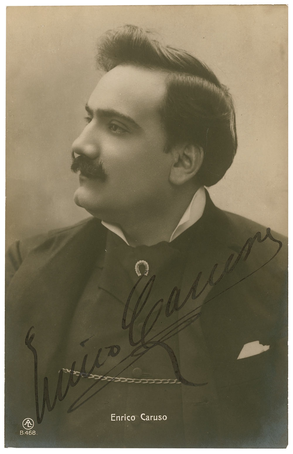 Vintage 3.5 x 5.5 postcard photo of Caruso in profile, signed in fountain pen. A few spots of soiling and mild silvering to the darker areas of the bottom corners, otherwise fine condition. Pre-certified PSA/DNA and RRAuction COA.