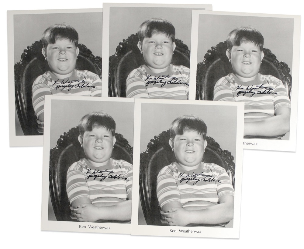 Five identical 8 x 10 cardstock photos of Weatherwax in character, each signed in black felt tip “Ken Weatherwax, Pugsley Addams.” In overall fine condition. RRAuction COA.