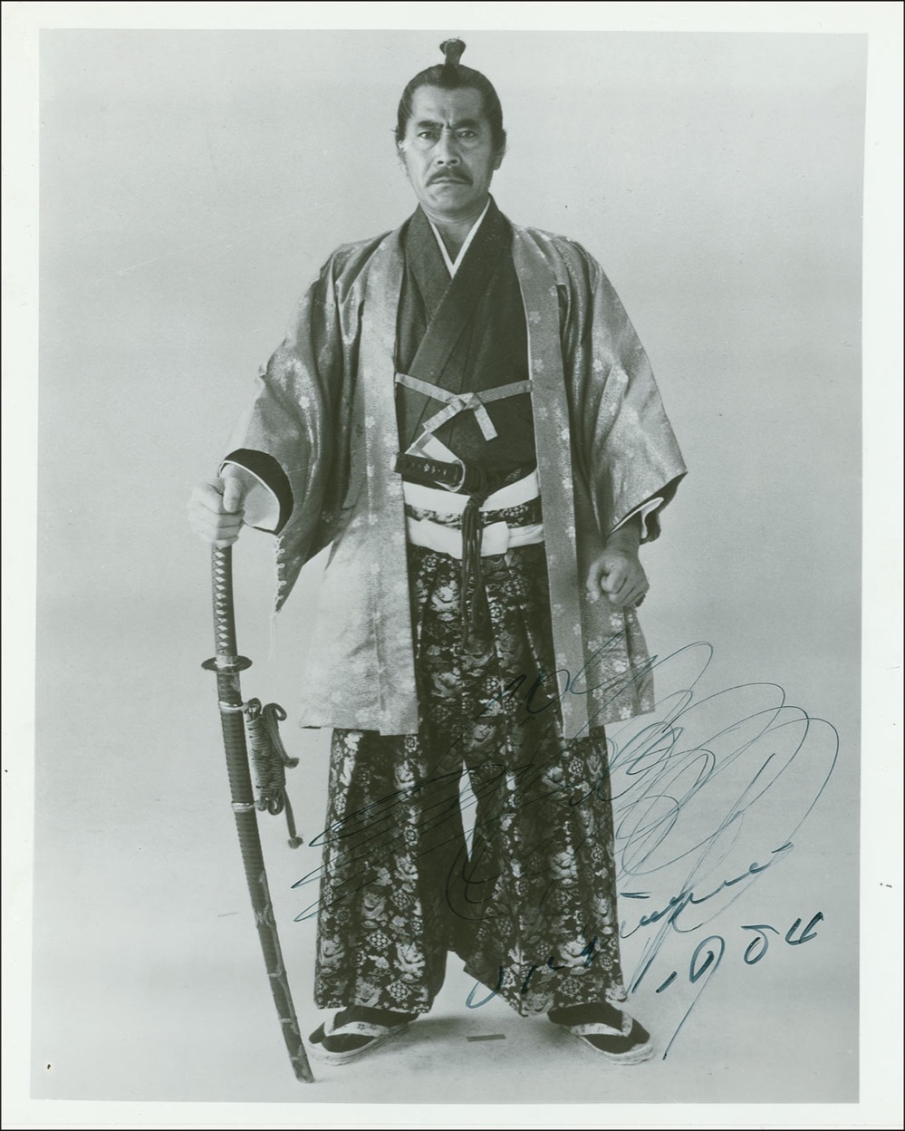 Intimidating glossy 8 x 10 full-length photo of Mifune as a samurai, emphatically signed in black felt tip and dated 1984. Light contrast to portion of signature, and some scattered light surface marks, dings, and impressions, otherwise fine condition. Pre-certified PSA/DNA and RRAuction COA.