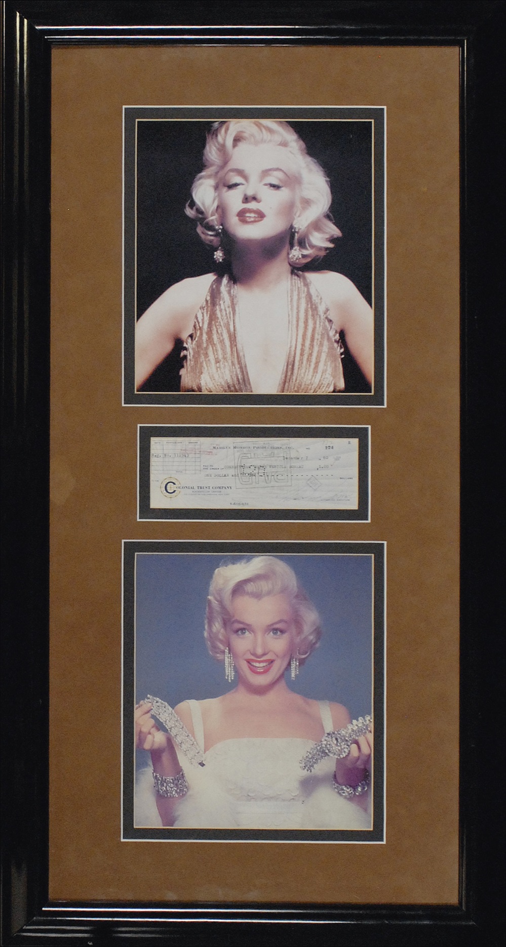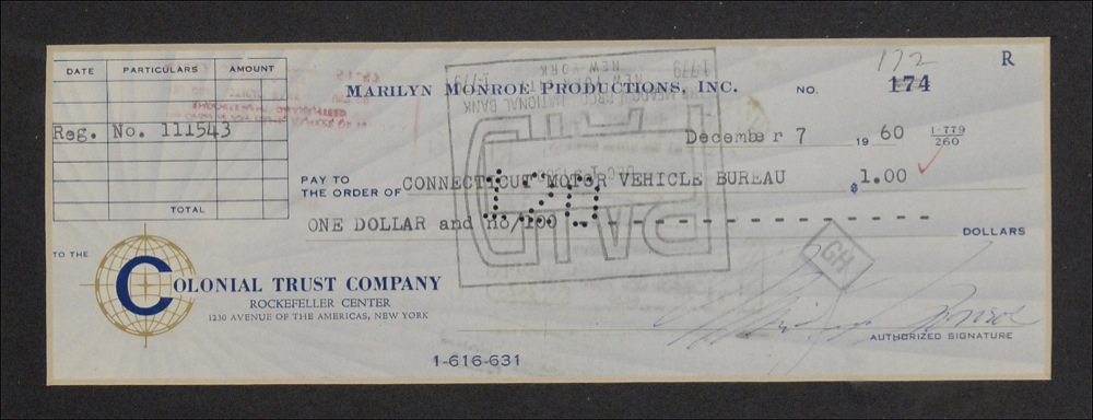 Marilyn Monroe Productions bank check, 8.25 x 3, filled out in type and signed by Monroe, payable to the Connecticut Motor Vehicle Bureau for $1.00, December 7, 1960. Elaborately double suede matted with two color photos and framed to an overall size of 20.5 x 38.5. Expected bank cancellation holes and stamps lightly affecting the signature, otherwise fine condition. A well-preserved example. Accompanied by a full letter of authenticity from James Spence Authentication as well as a certificate of authenticity from Steiner. Oversized. Pre-certified PSA/DNA and RRAuction COA.