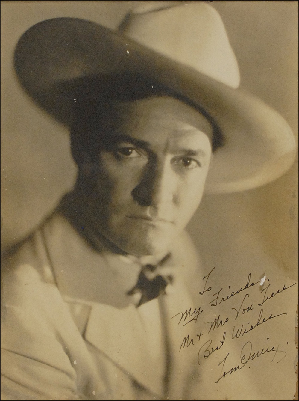 Vintage matte-finish 10 x 13.25 photo of Mix in cowboy attire, signed and inscribed in fountain pen “To My Friends Mr. & Mrs. Von Tress, Best Wishes, Tom Mix.” Affixed to same-sized piece of cardboard and framed to an overall size of 14.25 x 17.25. In very good condition, with strips of staining along the left side and lower left corner, a semi-circular stain to the right side touching his hat, edge chipping and chipping to the emulsion, and some areas of silvering to the darker areas. Pre-certified PSA/DNA and RRAuction COA.