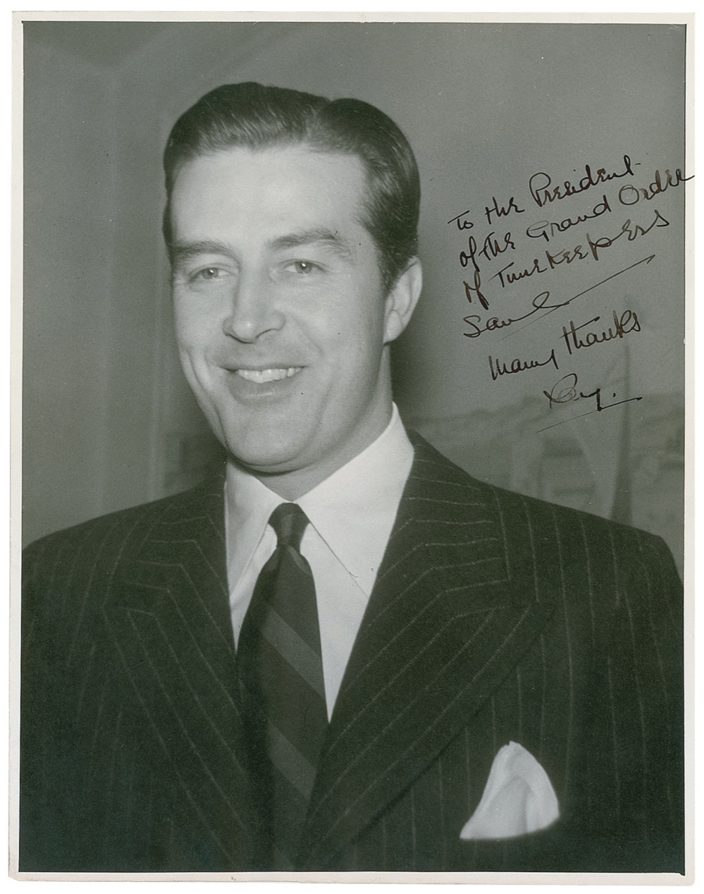 Actor and director (1905–1986) best-remembered for his Academy Award–winning portrayal of an alcoholic writer in The Lost Weekend (1945). Vintage matte-finish 8 x 10 photo, signed and inscribed in-person in fountain pen “To the President of the Grand Order of Timekeepers, Saul, Many thanks, Ray.” Rippling to horizontal edges, otherwise fine condition. Accompanied by a second vintage glossy 8 x 10 Paramount publicity photo, inscribed in fountain pen, “To Saul, Good bye (which Milland has crossed out), I mean Good luck.” Saul Goodman Collection. Pre-certified PSA/DNA and RRAuction COA.