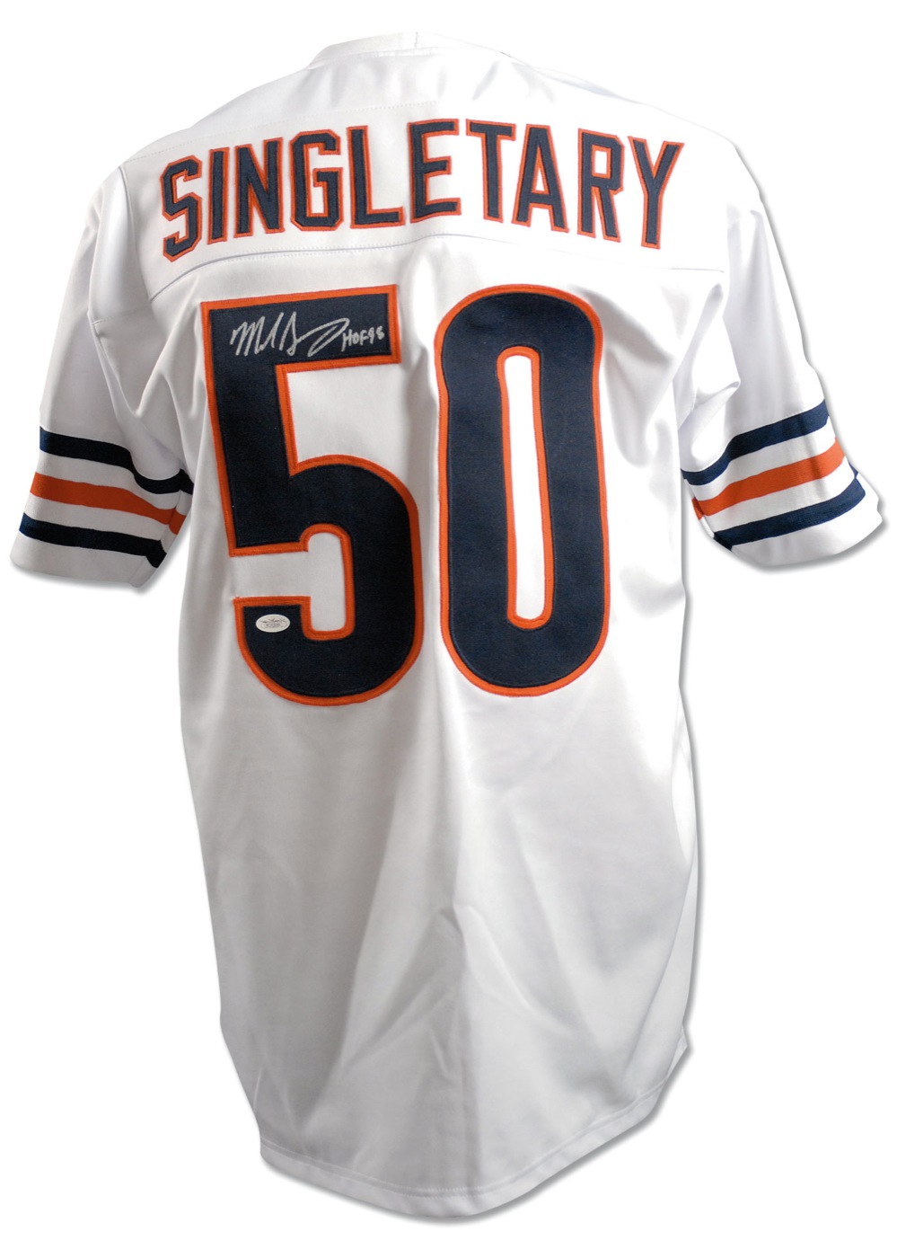 Replica Chicago Bears football jersey, with sewn on letters and numbers, signed in silver ink on the number on the back, “Mike Singletary HOF 98.” In very fine condition. Accompanied by a certificate of authenticity from James Spence. Pre-certified Steve Grad/PSA/DNA and RRAuction COA.