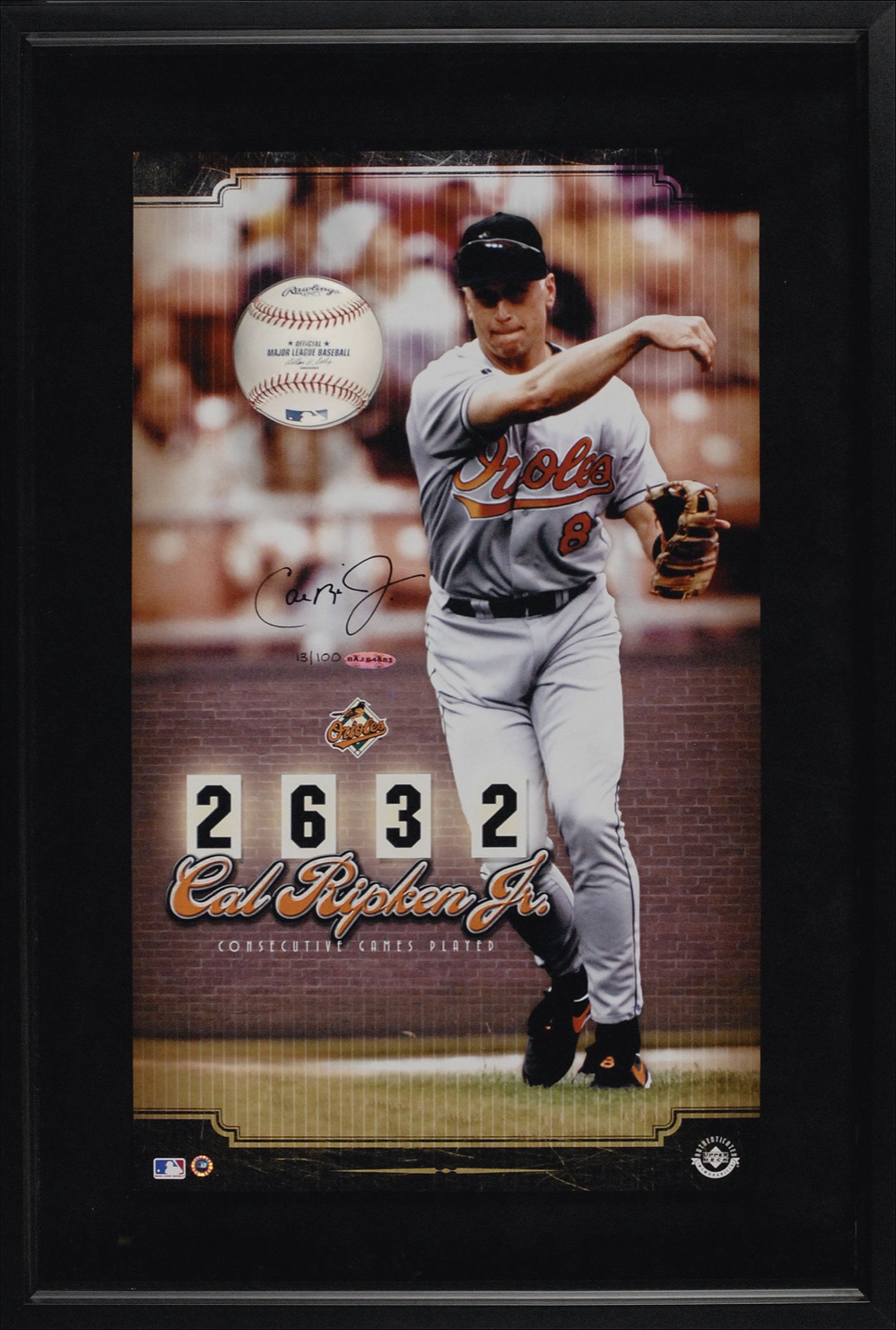 Color limited edition 12 x 20 print entitled ‘Cal Ripken, Jr.,’ honoring Ripken’s 2,632 consecutive games played with the Baltimore Orioles, numbered #13/100, signed in black felt tip. Shadow-boxed with a Rawlings baseball to an overall size of 17 x 25 x 3.5. In very fine condition with an Upper Deck Authenticated logo affixed. Accompanied by a certificate of authenticity from Upper Deck. Pre-certified Steve Grad/PSA/DNA and RRAuction COA.