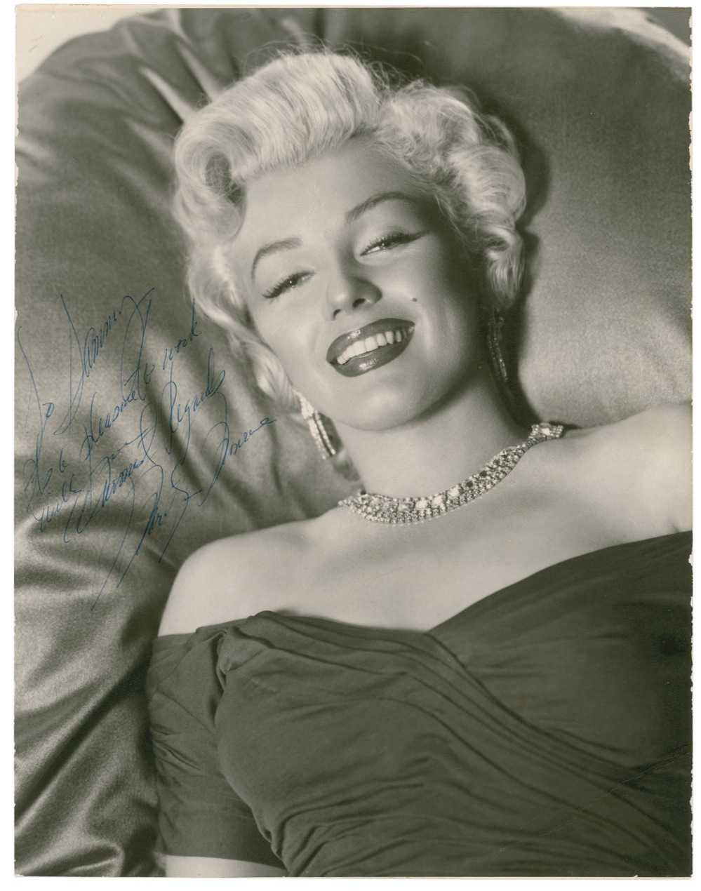 Vintage oversized matte-finish 10.5 x 13.5 crystal-clear head-and-shoulders smiling portrait of the recumbent Marilyn lying on a cushion, adorned in diamonds with her hair and make-up looking perfect and precise, signed and inscribed in blue ballpoint, “To Sammy. It’s a pleasure to work with you. Warmest regards, Marilyn Monroe.” Larger format photos such as this were generally only given to very close friends or other personal acquaintances, and are very seldom offered for sale; in this case, the ‘Sammy’ Marilyn refers to is Sam Benson from the Wardrobe Department who worked on numerous Monroe films including Gentlemen Prefer Blondes and How To Marry A Millionaire. In very good to fine condition, with lightly trimmed edges, some scattered light surface loss to edges, a diagonal crease to lower right corner, remarkably unobtrusive professionally repaired creases to her forehead area and to an area of the cushion background, and a few light spots to lower portion of image, none of which affects her florid handwriting or strikingly large signature. Accompanied by a letter of authenticity from James Spence. A rare and exquisite portrait, exceedingly uncommon in this oversized and highly displayable format. Pre-certified PSA/DNA and RRAuction COA.