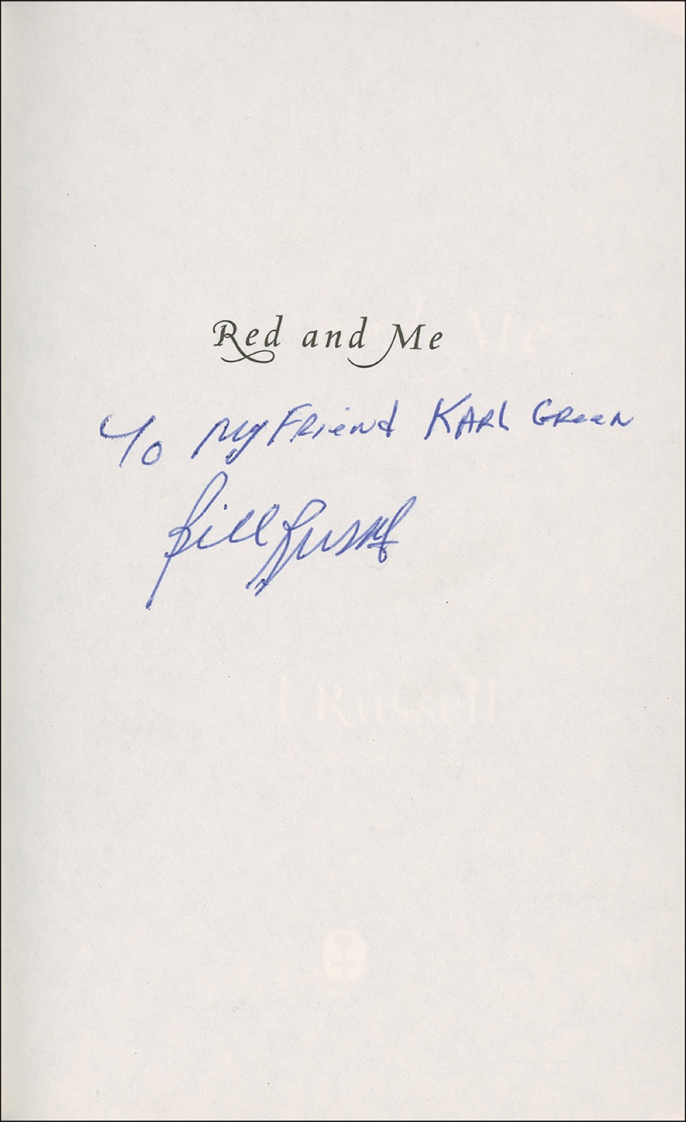 Signed book: Red and Me. First edition, first printing. NY: HarperCollins, 2009. Hardcover with dustjacket, 5.75 x 8.5, 187 pages. Signed and inscribed in blue ballpoint on the half title page, “To my friend Karl Green, Bill Russell.” In fine condition, with a couple of surface impression to the dustjacket. Pre-certified Steve Grad/PSA/DNA and RRAuction COA.