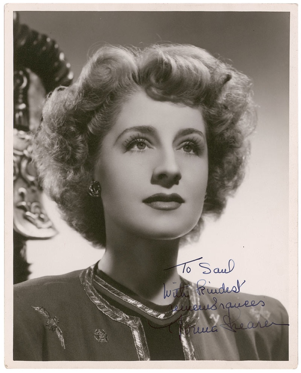 Sophisticated vintage matte-finish 8 x 10 head-and-shoulders photo, signed and inscribed in-person in fountain pen, “To Saul, With kindest remembrances, Norma Shearer.” In fine condition, with light rippling at both the top and bottom edge, and trivial creasing. Saul Goodman Collection. Pre-certified PSA/DNA and RR Auction COA.