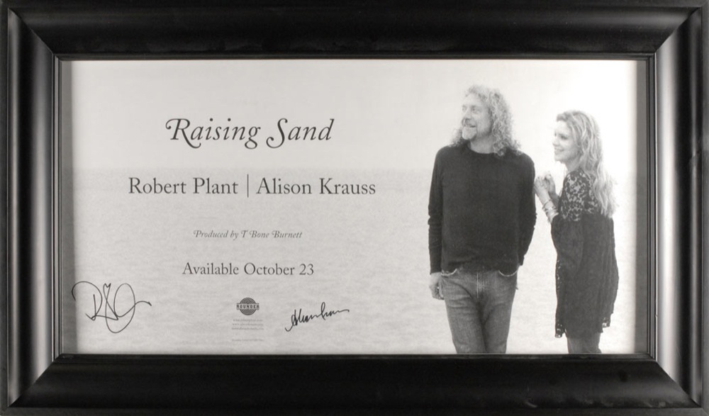 Promotional poster, 23.5 x 12, for the release of Raising Sand, signed in black felt tip by Robert Plant and Alison Krauss. Framed to an overall size of 28.5 x 16.5. In fine condition. Oversized. Pre-certified Roger Epperson/REAL and RR Auction COA.