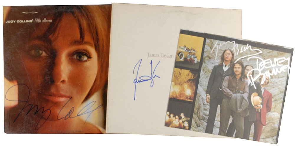 Three items: two albums, James Taylor self-titled album signed in blue felt tip, and Judy Collins’ Fifth Album signed in blue felt tip; and an America poster signed in silver ink by Gerry Beckley and Dewey Bunnel. In overall very good to fine condition with scattered creasing, surface wear, and some light soiling. The albums are included. RRAuction COA.