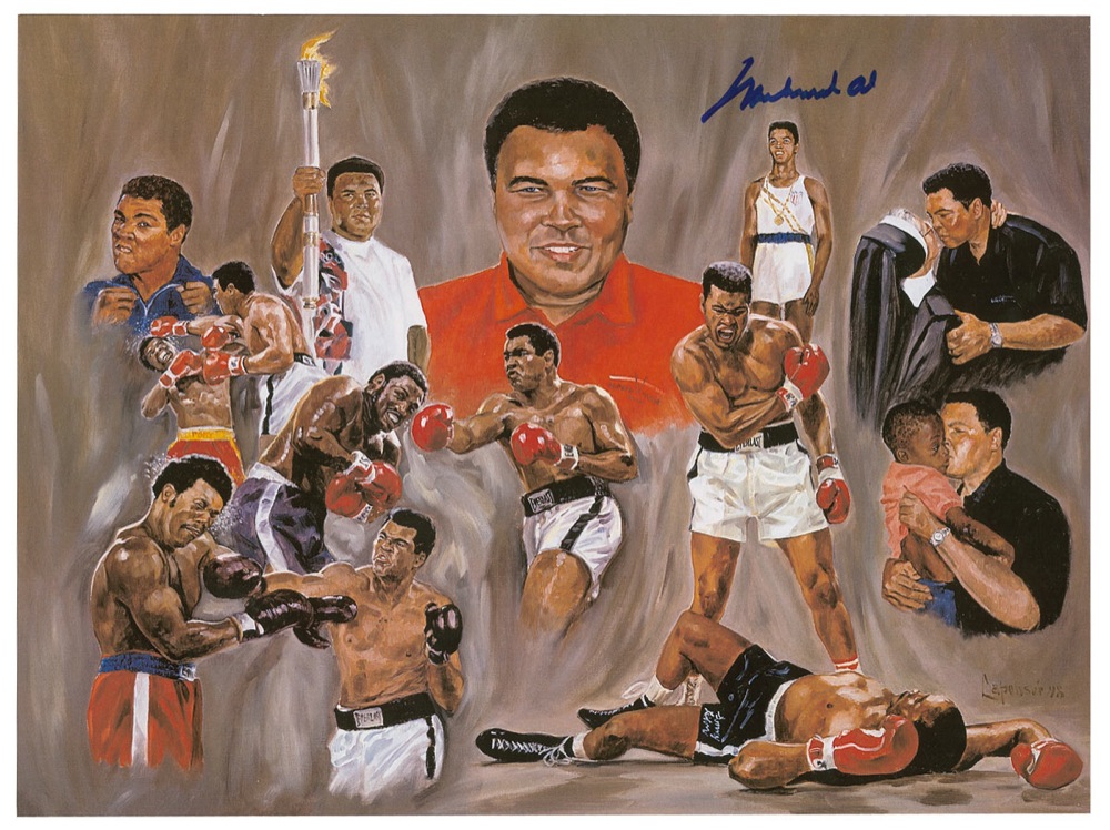 Color 14 x 10.5 composite print of Muhammad Ali through the years, signed in blue felt tip. In fine condition. Pre-certified Steve Grad/PSA/DNA and RR Auction COA.