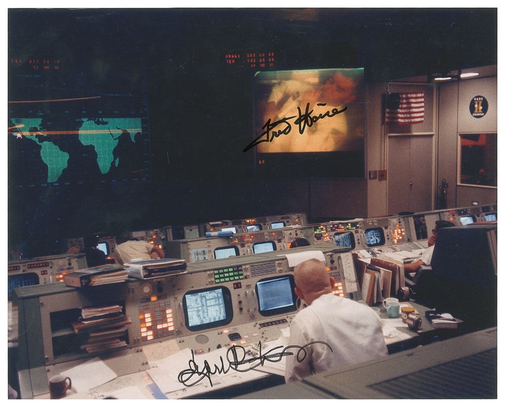 Color glossy 10 x 8 photo of Kranz monitoring Haise from Mission Control, signed in black felt tip by both Fred Haise and Gene Kranz. In fine condition. Pre-certified Scott Cornish and RR Auction COA.