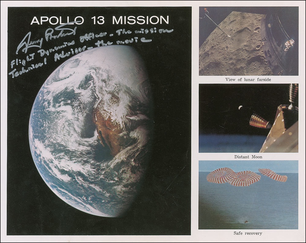 Color 10 x 8 composite NASA photo of the Apollo 13 mission, signed in silver ink “Jerry Bostick, Flight Dynamics Officer—the mission, Technical Advisor—the movie.” In fine condition, with a few scattered bends. Pre-certified Steve Zarelli and RR Auction COA.