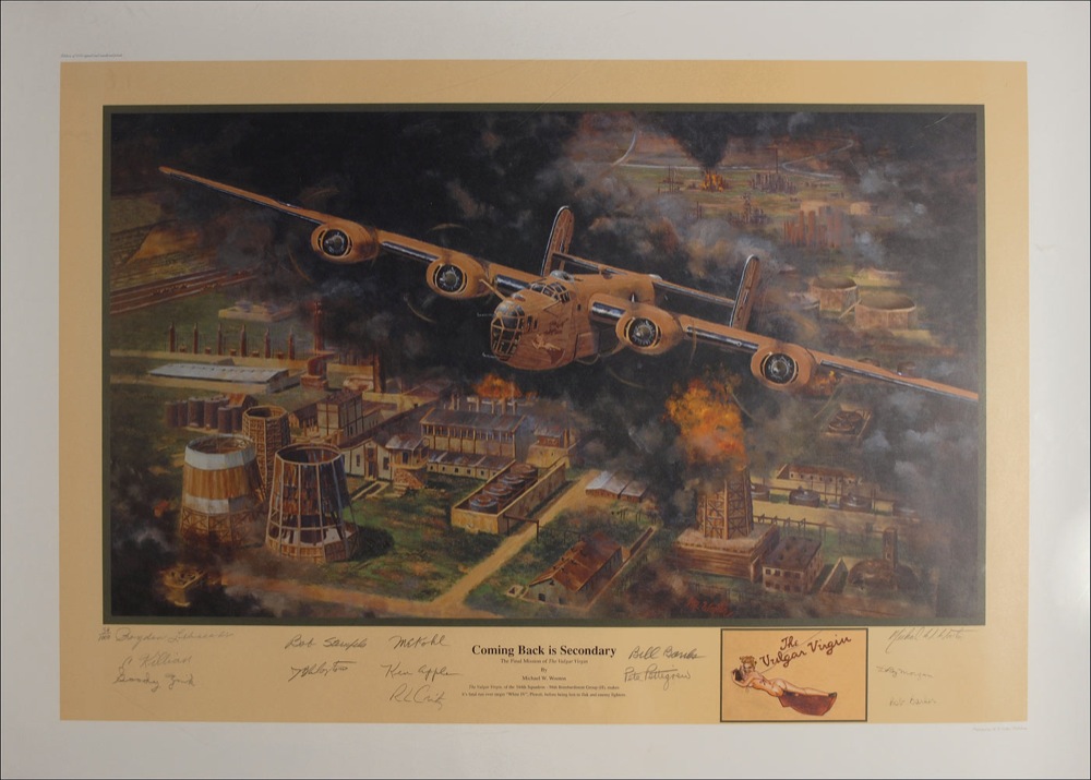Limited edition 33.75 x 24.5 lithograph entitled ‘Coming Back is Secondary,’ numbered #34/100, signed in pencil by 12 former pilots and crewmen who were veterans of the attacks made against German-held oil refineries at Ploesti. Signers are: Jackson B. Clayton, Royden Lebrecht, Clint Killian, Grover Zink, Bill Banks, Pete Pettigrew, Leroy Morgan, Bob Sternfels, Bob Barker, Milton Kohl, Richard Critz, and Kenneth Apple. Also signed by the artist, Michael W. Wooten. Rolled and in fine condition. Accompanied by a booklet containing biographical information on each signer, a certificate of authenticity from the artist, and a printed description of the missions. RRAuction COA.