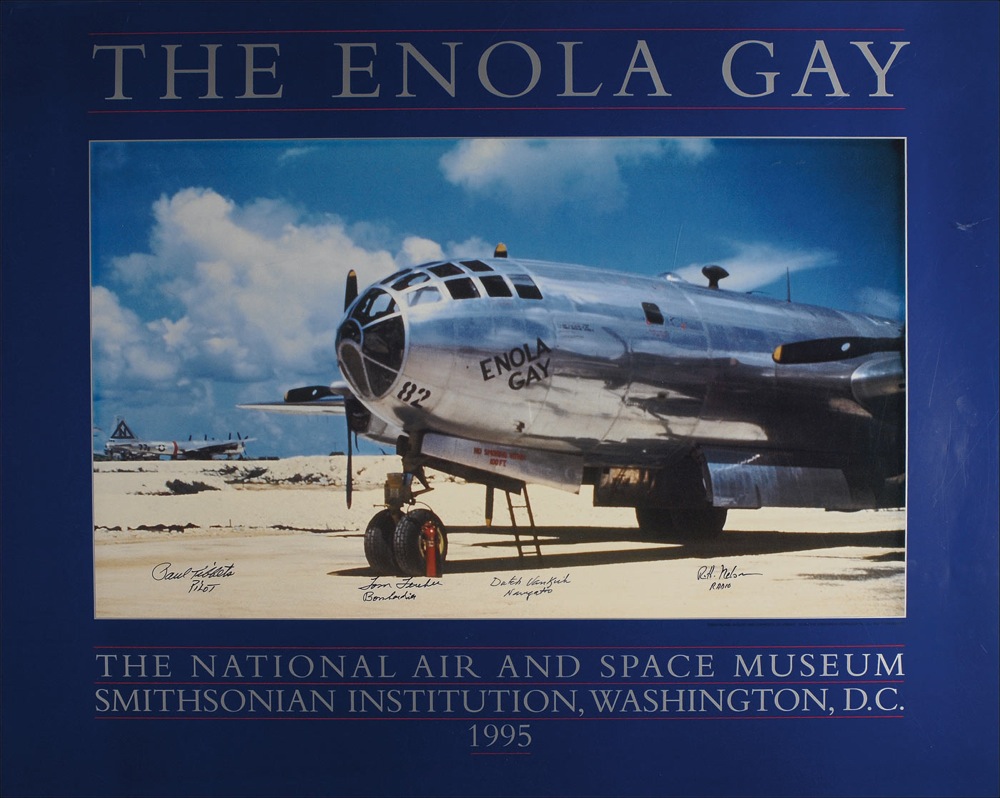 Color 29.75 x 24 poster entitled ‘The Enola Gay,’ published in recognition of the 50th anniversary of the aircraft’s history flight, signed in black felt tip by Paul Tibbets, Tom Ferebee, Dutch Van Kirk, and R. H. Nelson, with each man adding his mission assignment. In fine condition. RRAuction COA.