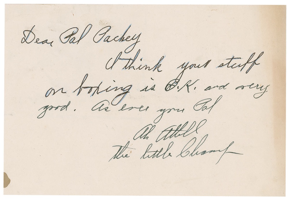 Boxing Hall of Famer (1884-1970) who was featherweight boxing champion of the world 1901–1912. Attell later became one of the instigators of the 1919 Chicago Black Sox scandal. ALS signed “Abe Attell, the little Champ,” one page, 8 x 5.5, no date. Brief letter to boxer Packey O’Gatty. In full: “I think your stuff on boxing is O.K. and very good. As ever your Pal Abe Attell the little Champ.” Attell had begun writing the letter with a blue pen that was running out of ink. At the “O” of “O.K.,” he changed pens, wrote over the beginning of his letter and continued in black ink. Aforementioned ink switch, central horizontal and vertical fold, one through a single letter of signature, and toning to right edge, otherwise fine condition. Kind words from one of boxing’s greatest, but controversial, figures. Pre-certified Steve Grad/PSA/DNA and RR Auction COA.