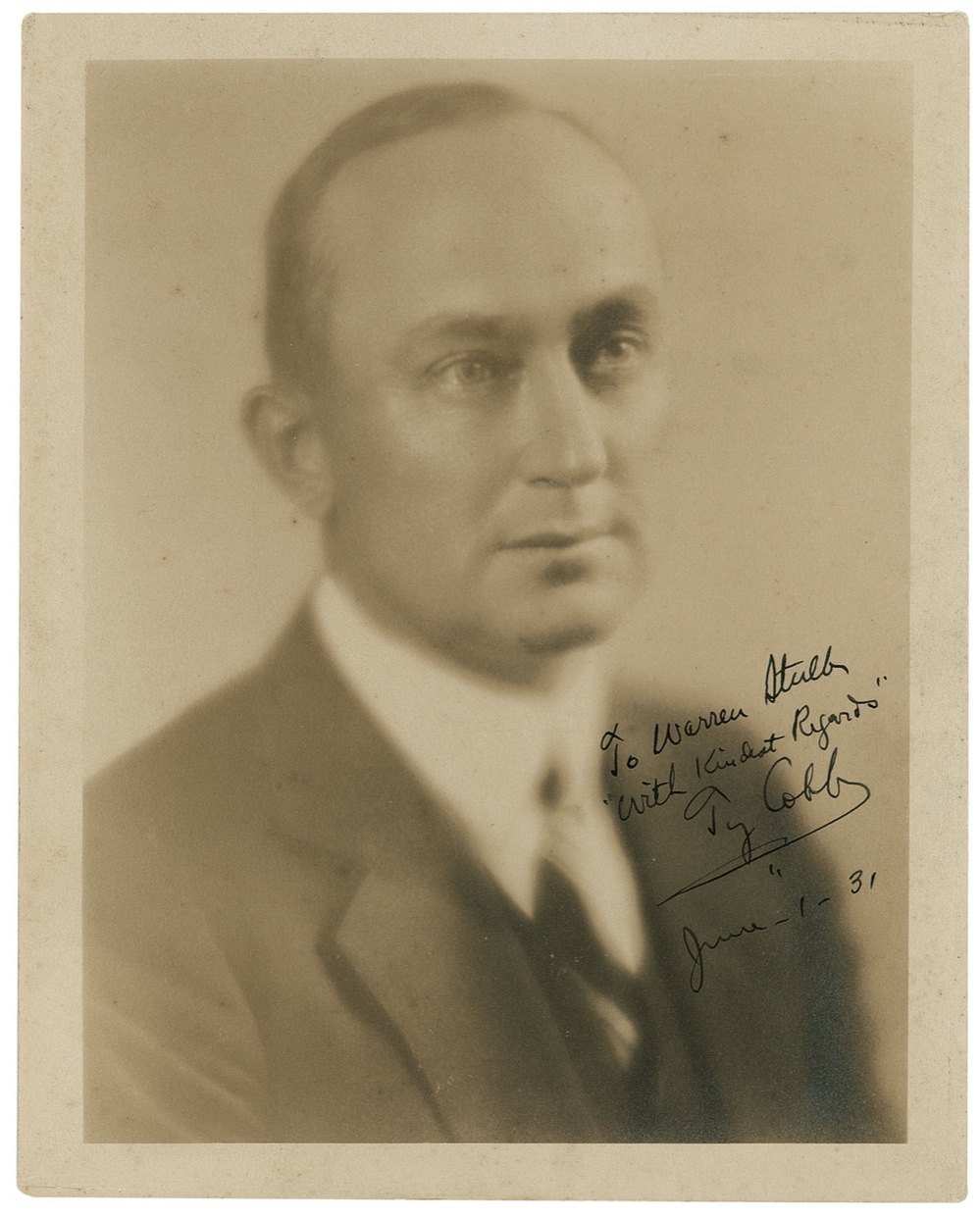 Vintage sepia matte-finish 8 x 9.75 head-and-shoulders photo of Cobb in a three-piece suit, signed and inscribed in fountain pen “To Warren Stulb, ‘With kindest regards’ Ty Cobb, June–1–31.” Scattered light silvering, and some scattered light foxing and creasing, otherwise fine condition. A superb signature on an unusual, uncommon portrait, expressing rare, cordial sentiments from The Georgia Peach while experiencing a personal and professional down-swing. Pre-certified Steve Grad/PSA/DNA and RR Auction COA.