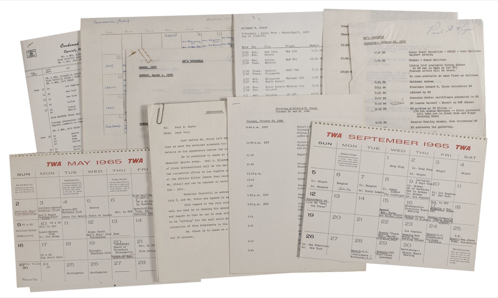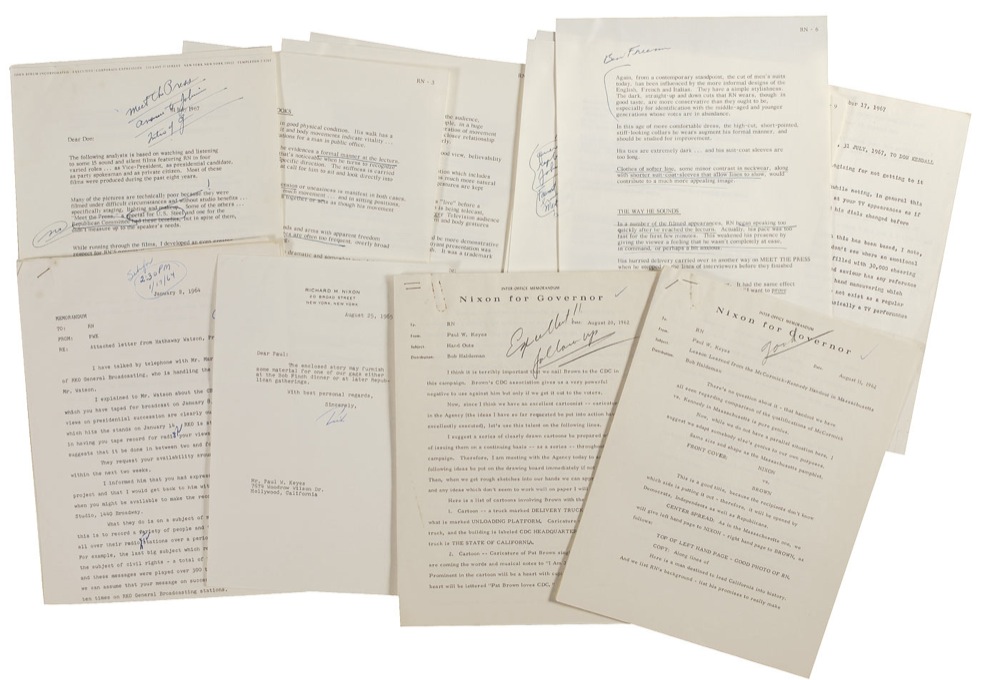 Archive of 81 documents from the papers of Paul W. Keyes, highlighted by a ten-page July 1967 professional critique of Nixon’s image on television with suggestions, bearing 20 words in Nixon’s hand and over 60 underlinings by Nixon whose telegenic image in his first debate with John F. Kennedy was one of the reasons he lost the election. Collection includes handwritten notes by Nixon on memos to and from him during his 1962 race for Governor of California-two signed-a 1965 Nixon TLS, Nixon’s monthly schedules (1963-1965), 1973 VP Agnew TLS five weeks before his resignation referring to his “troubles” with transcripts of October phone calls, early letters to Keyes from Regis Philbin (1962) and Diane Sawyer (1973).
