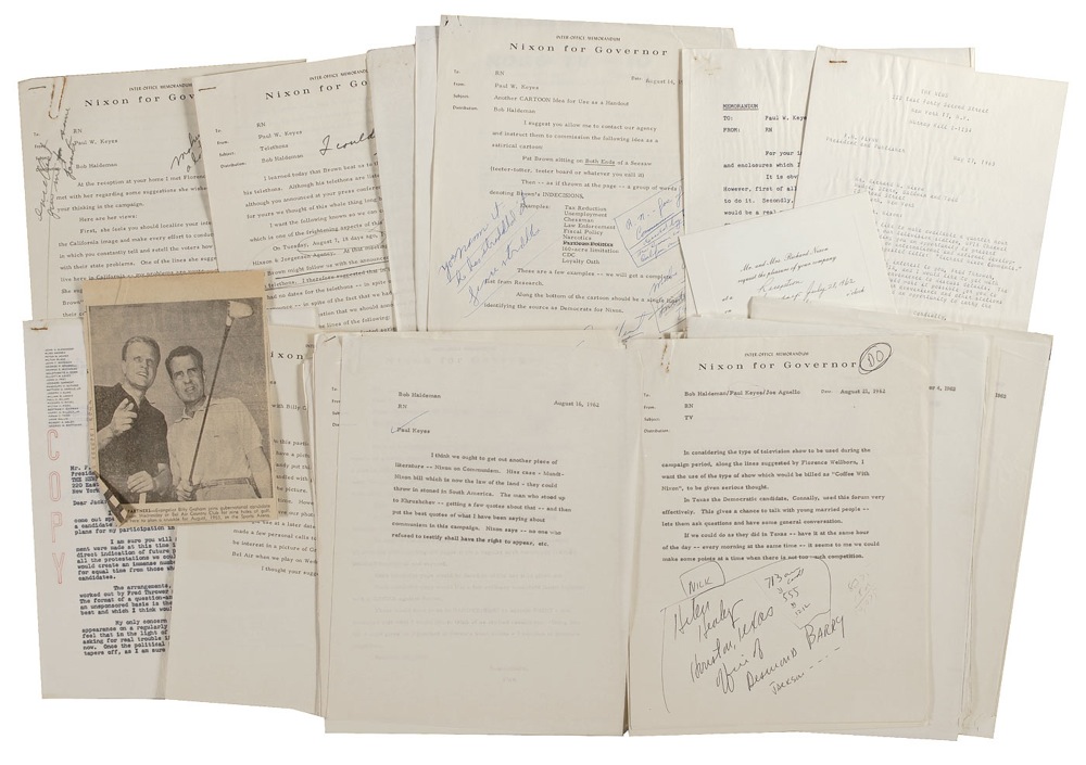 (5) H. R. “Bob” Haldeman. Keyes’ file from Nixon’s 1962 unsuccessful campaign for Governor of California including suggestions for photographs of Nixon golfing with evangelist Billy Graham (with a newspaper photo of their July 25, 1962, golf date); typed July 20, 1962, memo to Bob Haldeman from Nixon “I want Paul Keyes included in all PR meetings whenever he is available” with handwritten notation by Haldeman: “He will be. He sat in on those during the primary when he was here. H.”
