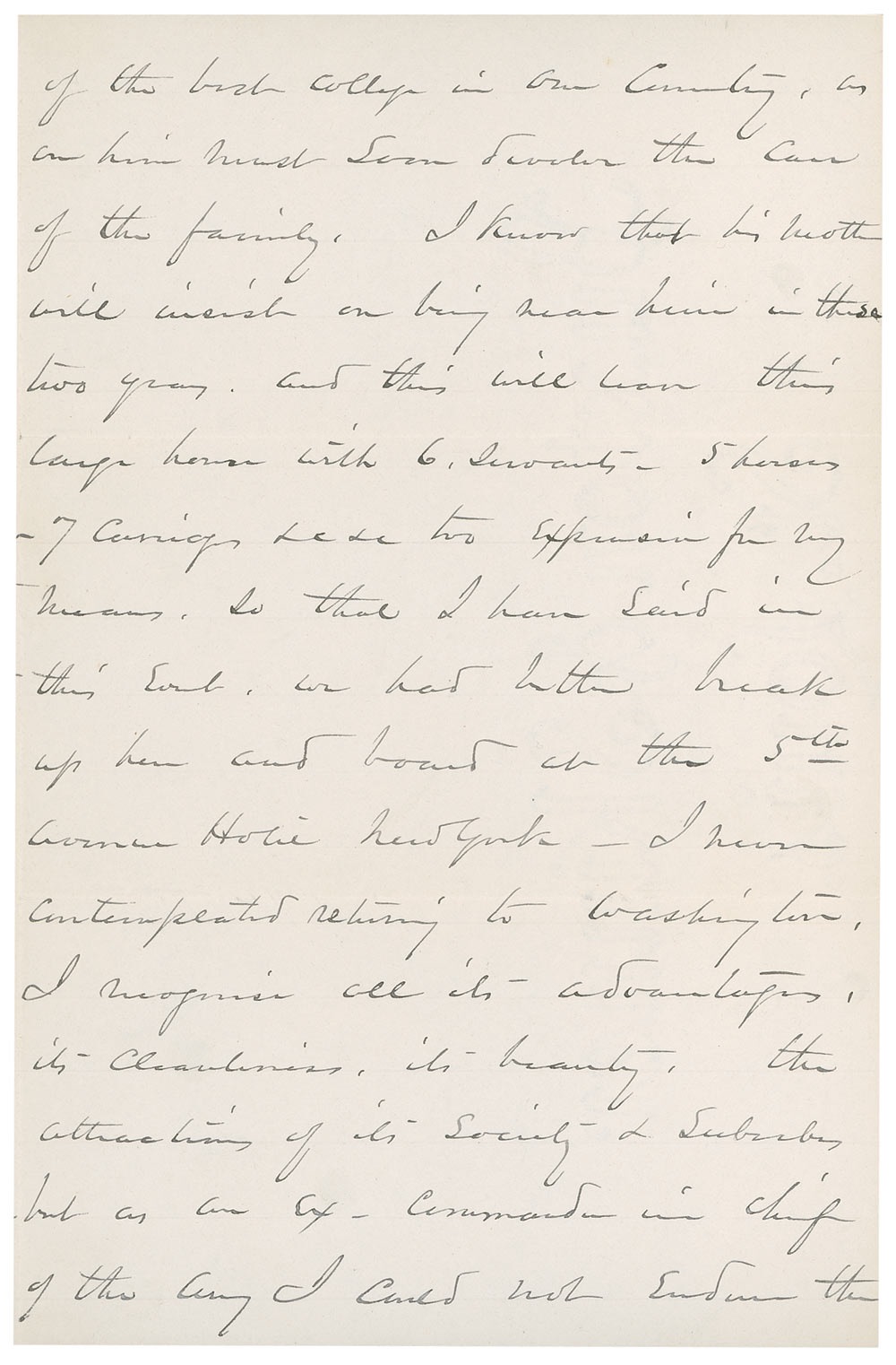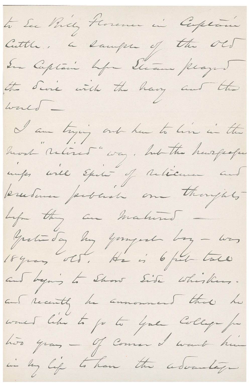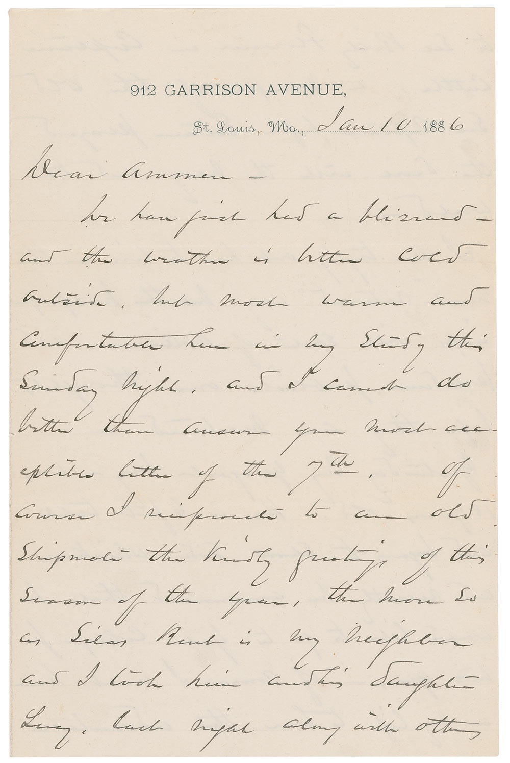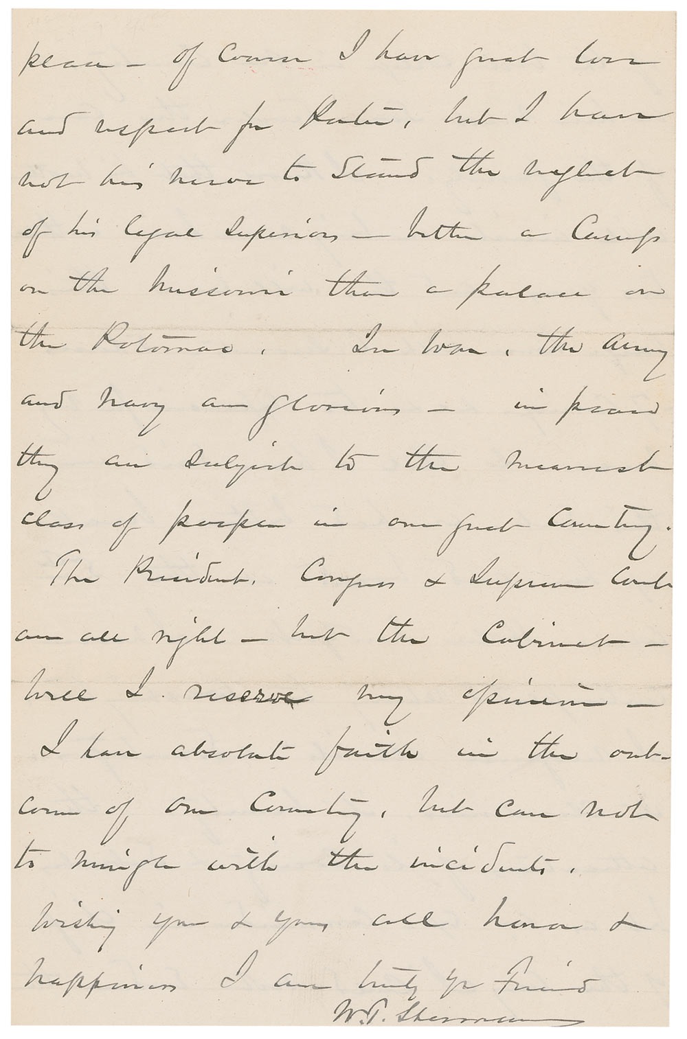 ALS signed “W. T. Sherman,” four pages on two adjoining sheets, 5.5 x 8.5, personal letterhead, January 10, 1886. Letter to Admiral Daniel Ammen. In part: “I reciprocate to an old Shipmate the kindly greetings of this season of the year, the more so as Silas Rush is my neighbor and I took him and his daughter Lucy, last night along with others to see Billy Florence in Captain Cuttle, a sample of the Old Sea Captain before Steam played the devil with the Navy and the world…Yesterday my youngest boy–was 18 years old. He is 6 feet tall and begins to show side whiskers and recently he announced that he would like to go to Yale College for two years –Of course I want him in my life to have the advantage of the best college in our country, as on him must soon devolve the care of the family. I know that his mother will insist on being near him in these two years and this will leave this large house with 6 servants–5 horses 7 carriages &c &c too expensive for my means so that I have said in this event we had better break up here and board at the 5th Avenue Hotel New York.