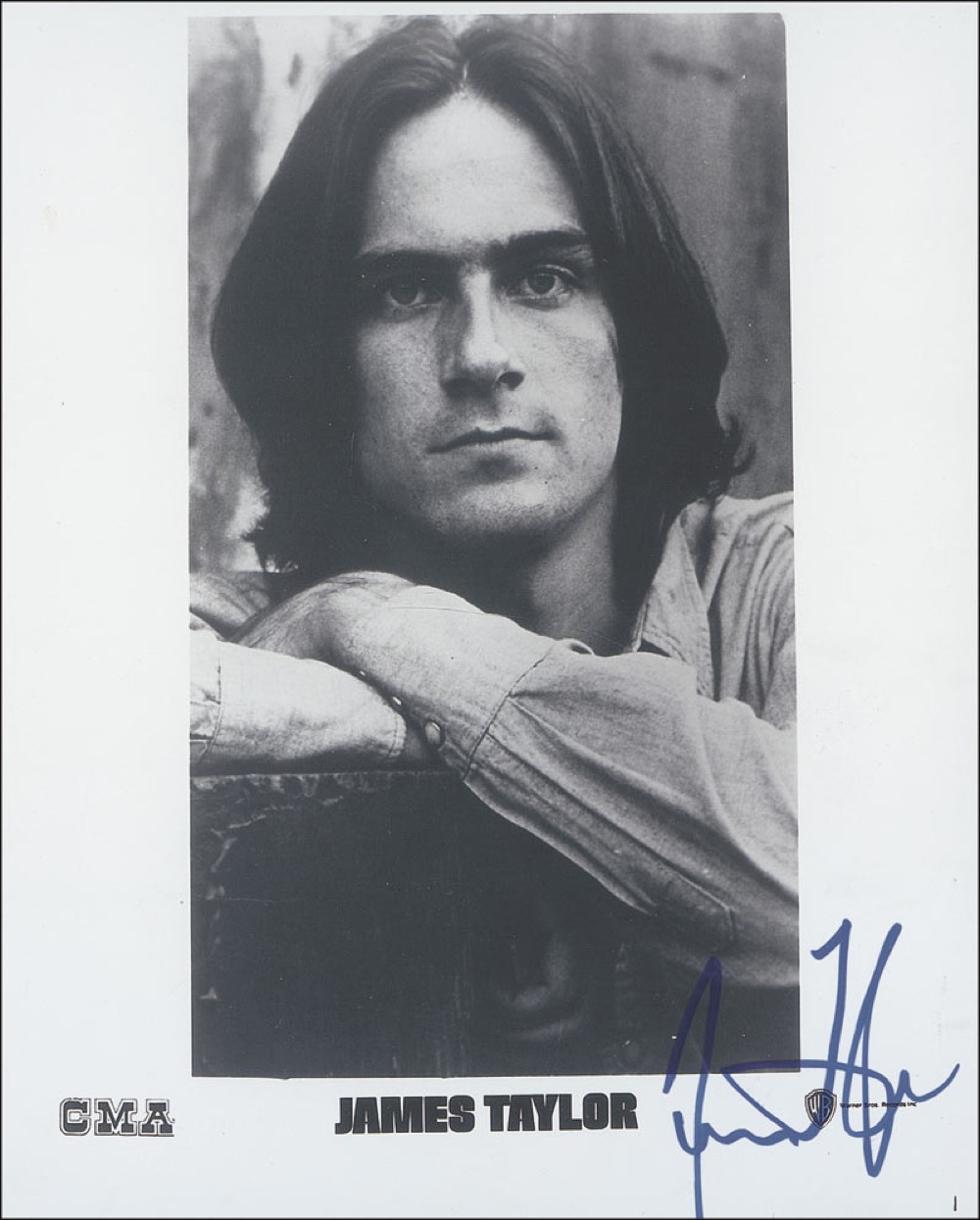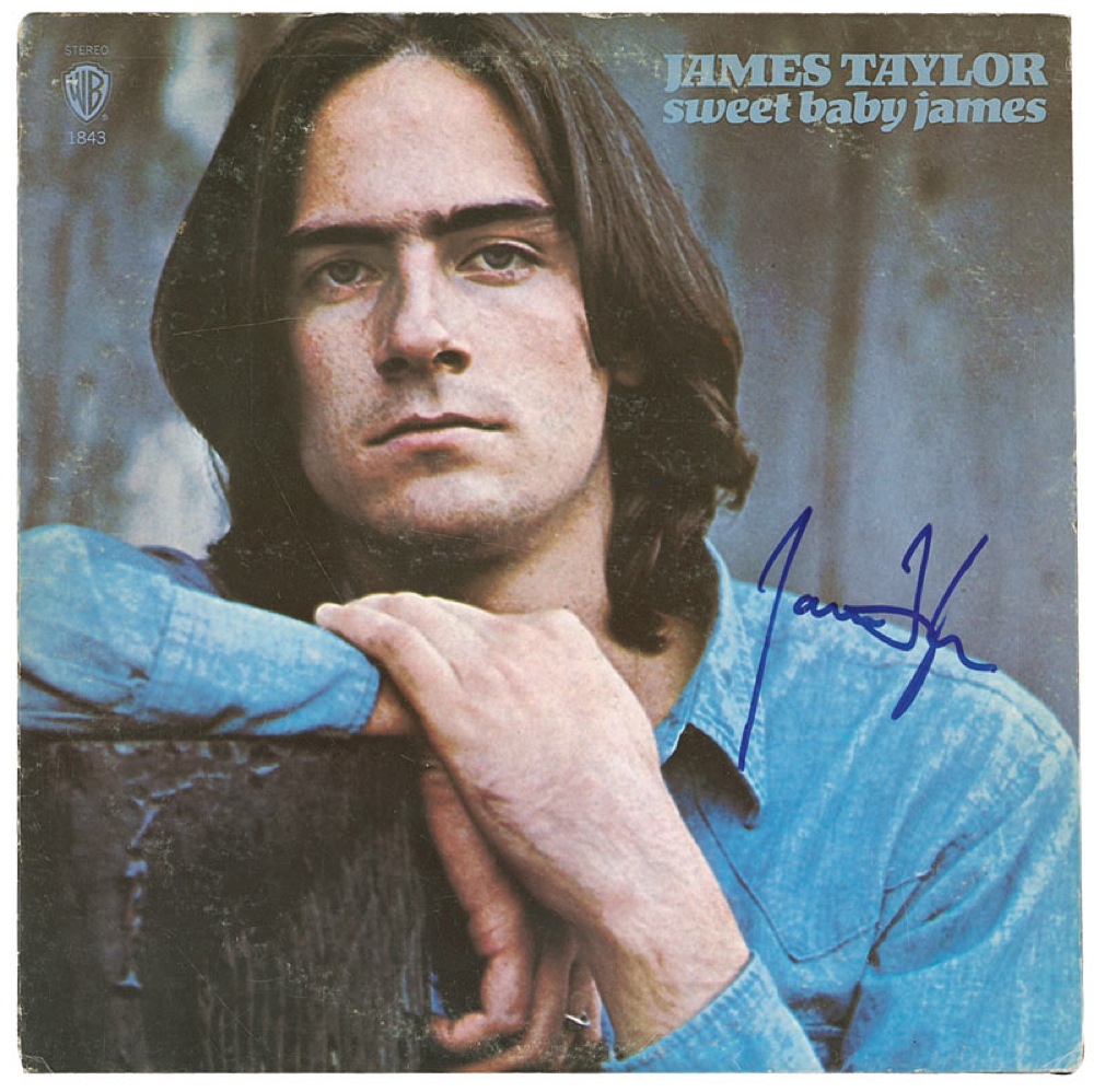 Two items: Sweet Baby James album, signed on the front cover in blue felt tip; and a glossy 8 x 10 publicity photo, also signed in blue felt tip. In fine condition, with scattered surface and edge wear and impressions to album cover. The record is included. RRAuction COA.