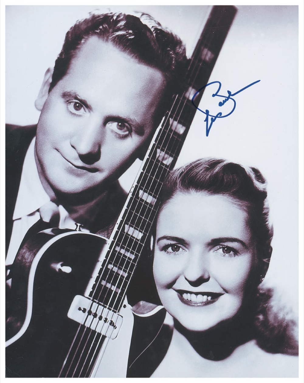 Two signed 11 x 14 glossy photos: one of Paul and Mary Ford signed in blue felt tip; and a color photo of Paul holding his guitar, signed in blue ink. In fine condition. RRAuction COA.