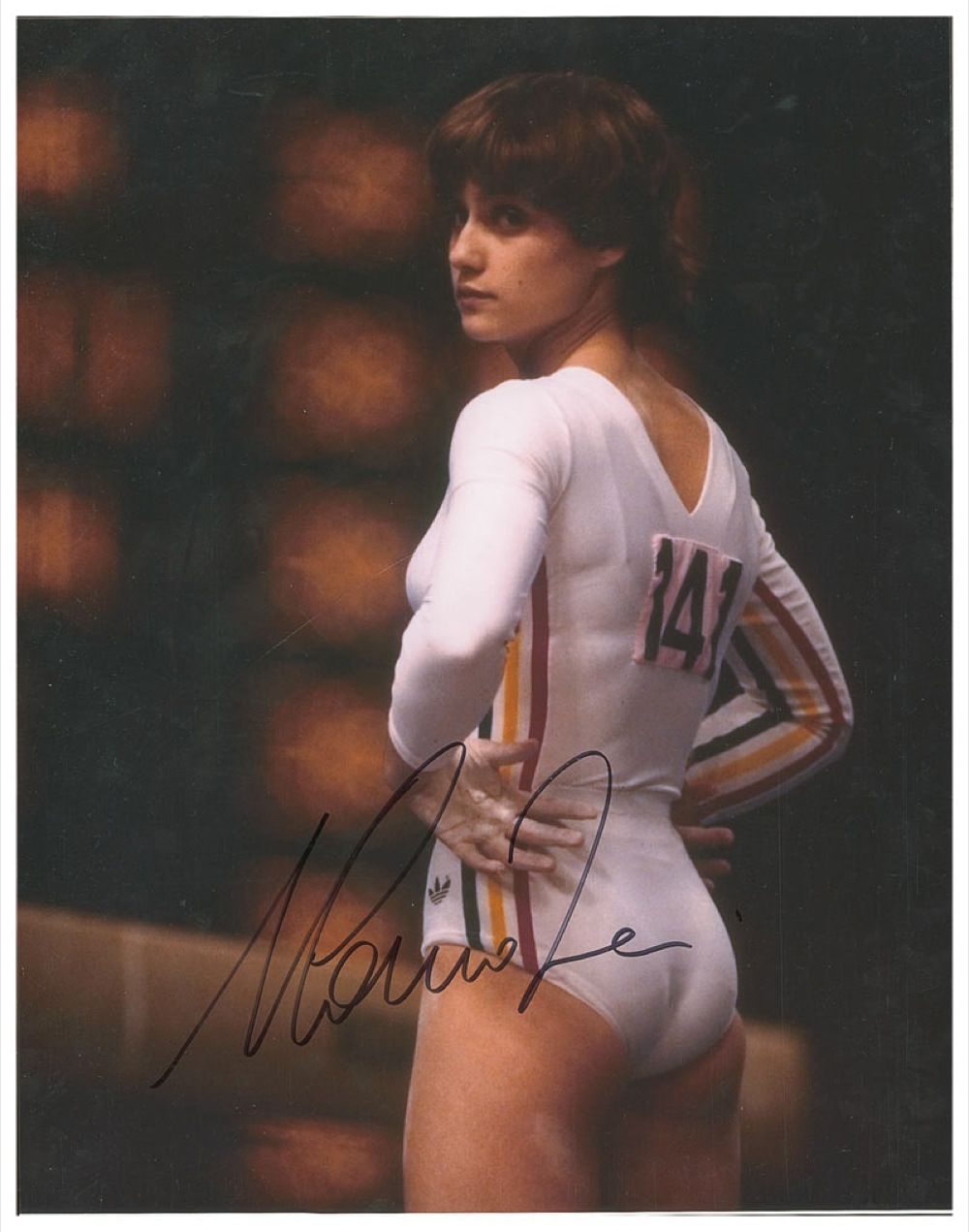 Color glossy 11 x 14 photo of Comaneci from the 1976 Summer Olympics, signed in black felt tip “Nadia Comaneci.” In fine condition. Pre-certified Steve Grad/PSA/DNA and RR Auction COA.