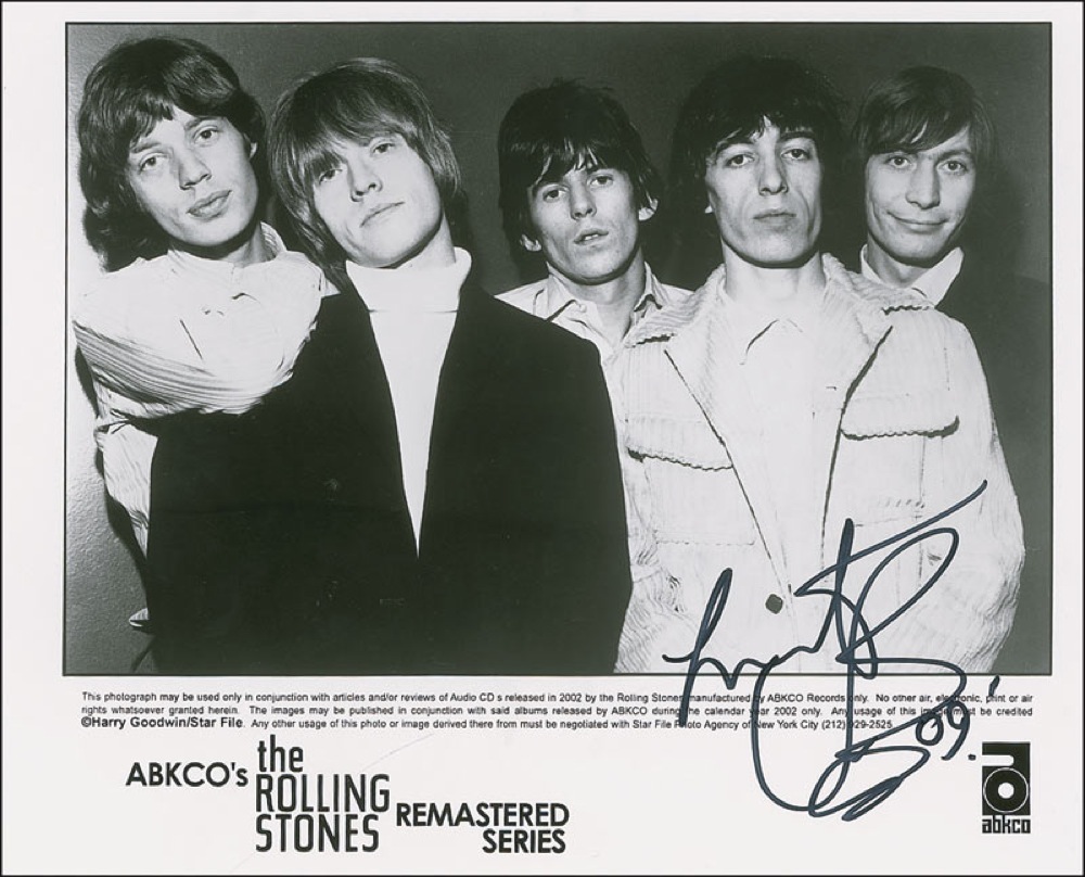 Two satin-finish photos, one 8 x 10 and one 10 x 8, including one of the original group, each signed in black felt tip by Watts. In very fine condition. Pre-certified Roger Epperson/REAL and RR Auction COA.