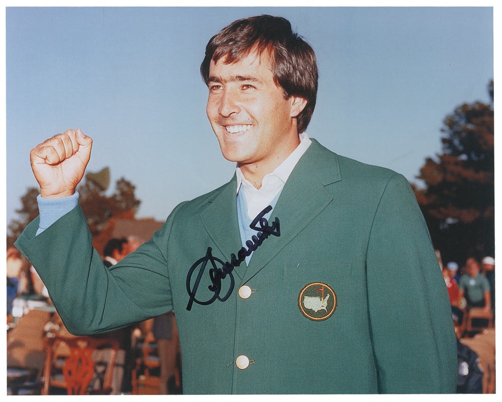 Color 10 x 8 photo of Ballesteros celebrating his Masters victory in his green jacket, signed in black felt tip. In very fine condition. Pre-certified Steve Grad/PSA/DNA and RR Auction COA.