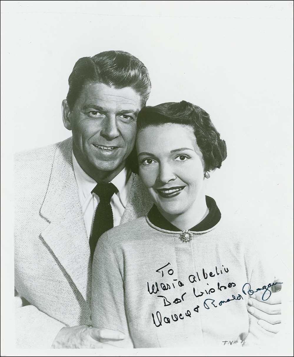 Glossy 8 x 10 photo of the Reagans, signed and inscribed in black felt tip “To Maria Albeliu, Best wishes, Nancy &” and “Ronald Reagan.” Noticeable horizontal crease along upper portion, which could be matted out, otherwise fine condition. Pre-certified PSA/DNA and RR Auction COA.