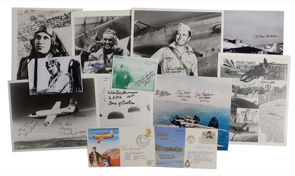 Twelve items: ten photos, mostly 8 x 10 or 10 x 8, various finishes, each signed in felt tip or ballpoint. Signers include: C. E. ‘Bud’ Anderson (2), Arthur Fiedler, ‘Wild’ Bill Guarnere, ‘Tex’ Hill, Bob Layher, John W. Mitchell, Chuck Older, Steve Pisanos, Joe Rosbert, Alex Vracis, and Chuck Yeager (ins); and two commemorative flight flown postal covers individually signed in ink by Curtis LeMay and Chuck Yeager. In overall fine condition. RRAuction COA.