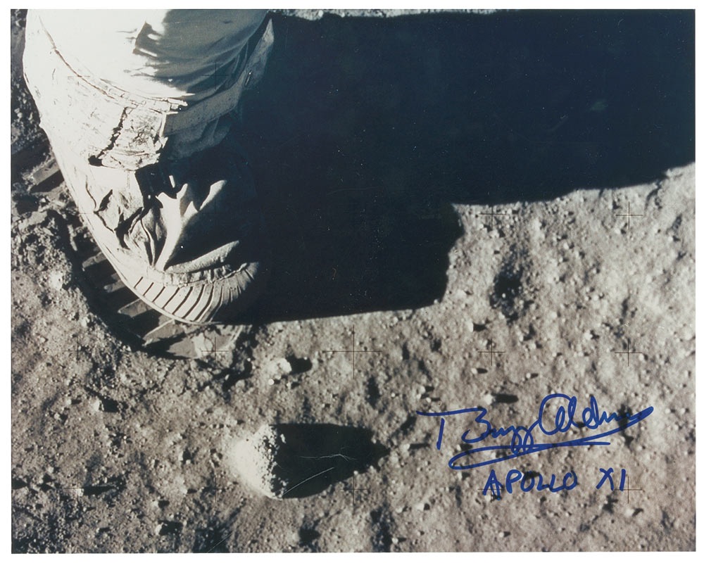Color satin-finish 10 x 8 photo of a lunar footprint, signed in blue felt tip, “Buzz Aldrin, Apollo XI.” In fine condition, with crease to lower portion of image. Pre-certified Scott Cornish and RR Auction COA.