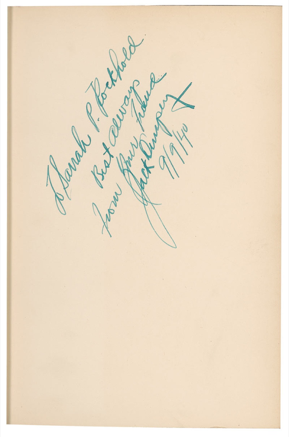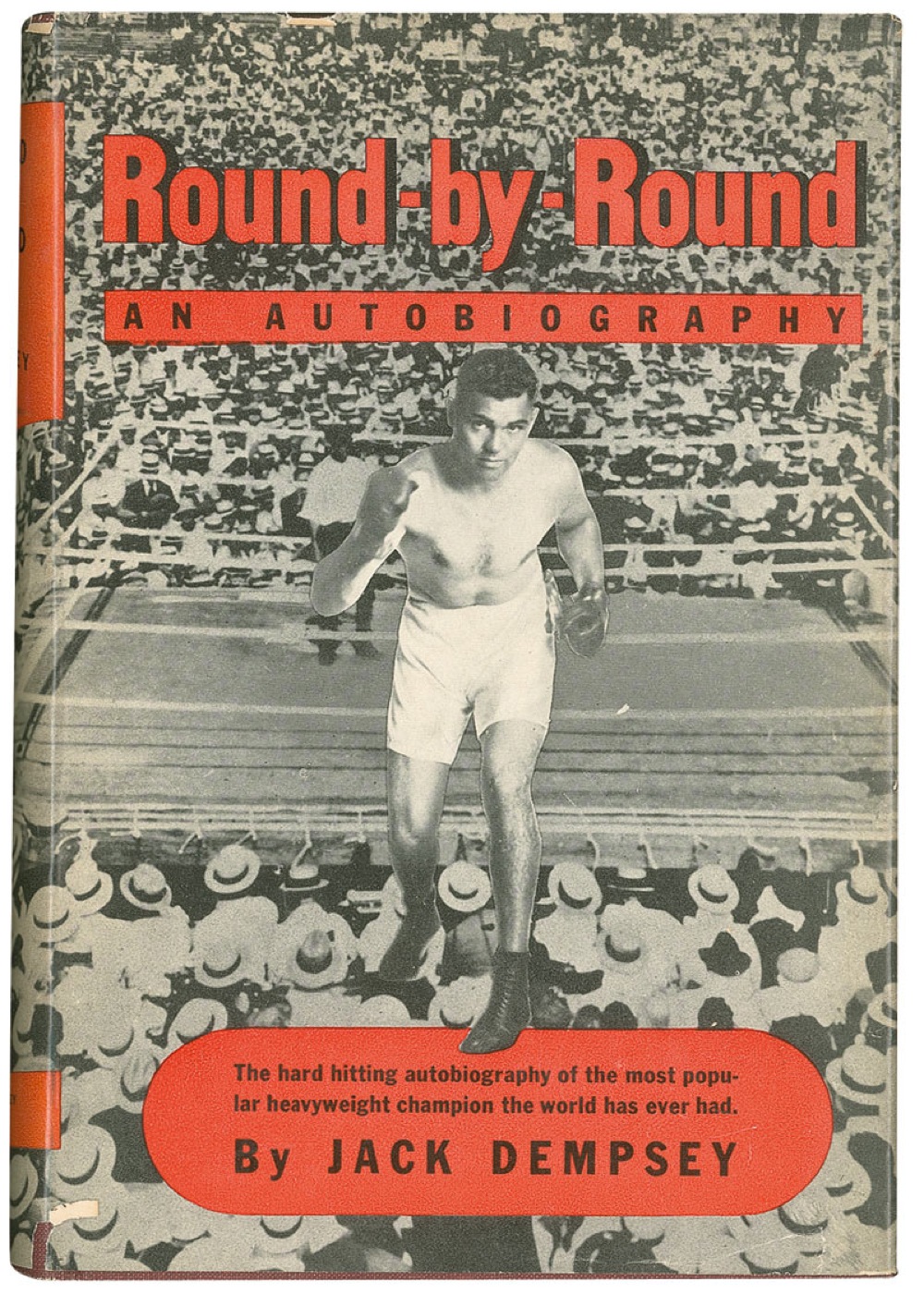 Signed book: Round-by-Round. First edition. NY: Whittesey House, 1940. Hardcover with dustjacket, 6.5 x 9.25, 285 pages. Signed and inscribed in fountain on the first free end page “To Sarrah P. Rockhold, Best Always From Your Friend Jack Dempsey 9/9/40.” In fine condition, with faint toning to the signed page, scattered light soiling and toning to the dustjacket and a clipped corner. Pre-certified Steve Grad/PSA/DNA and RR Auction COA.