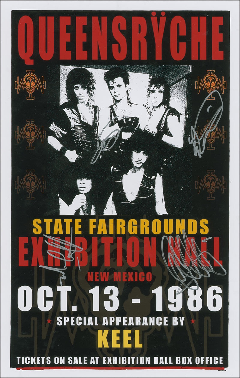 Color glossy 11 x 17 photo of a poster for a concert at the New Mexico State Fairgrounds, signed in silver ink by Geoff Tate, Michael Wilton, Eddie Jackson, and Scott Rockenfield. In very fine condition. RRAuction COA.