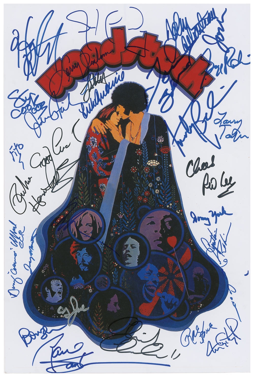 Color satin-finish 12 x 18 photo, signed in felt tip and ink by 28 performers including: Joe Cocker, Arlo Guthrie, Richie Havens, John Sebastian, Leslie West of Mountain, Jefferson Airplane’s by Paul Kantner, Jack Casady, and Marty Balin, Country Joe McDonald, Creedence Clearwater Revival’s by Doug Cosmo Clifford and Stu Cook, Gregg Rolie of Santana, Tom Constanten of Grateful Dead, Sly and the Family Stone’s Larry Graham, Jerry Martini, Rose Stone, and Cynthia Robinson, Canned Heat’s Fito de la Parra, Harvey Mandel, and Larry ‘The Mole’ Taylor, Ten Years After’s Ric Lee, Leo Lyons, and Chick Churchill, Sha Na Na’s Jacko, Bowzer, and Donny York, Tommy Shannon of the Johnny Winter Band, David Sanborn of Butterfield Blues Band, and Jim Fielder of Blood Sweat and Tears. In fine condition. Pre-certified PSA/DNA and RR Auction COA.