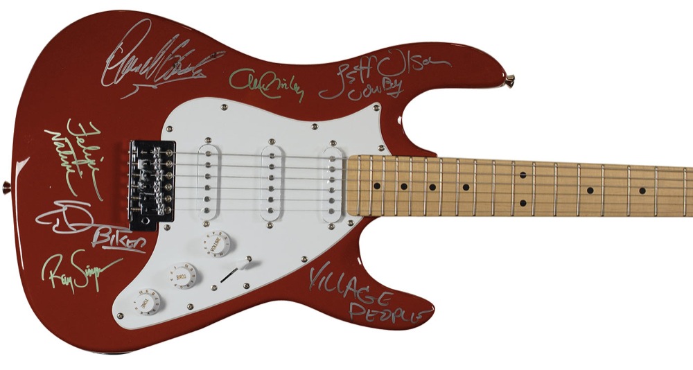 Red-bodied California ‘stratocaster-style’ electric guitar, signed on the body in green and silver ink by Felipe Rose, Alex Briley, David Hodo, Jeff Olson, Ray Simpson, and Eric Anzalone, with one member adding the band’s name to the body. In fine condition. Oversized. Pre-certified PSA/DNA and RR Auction COA.